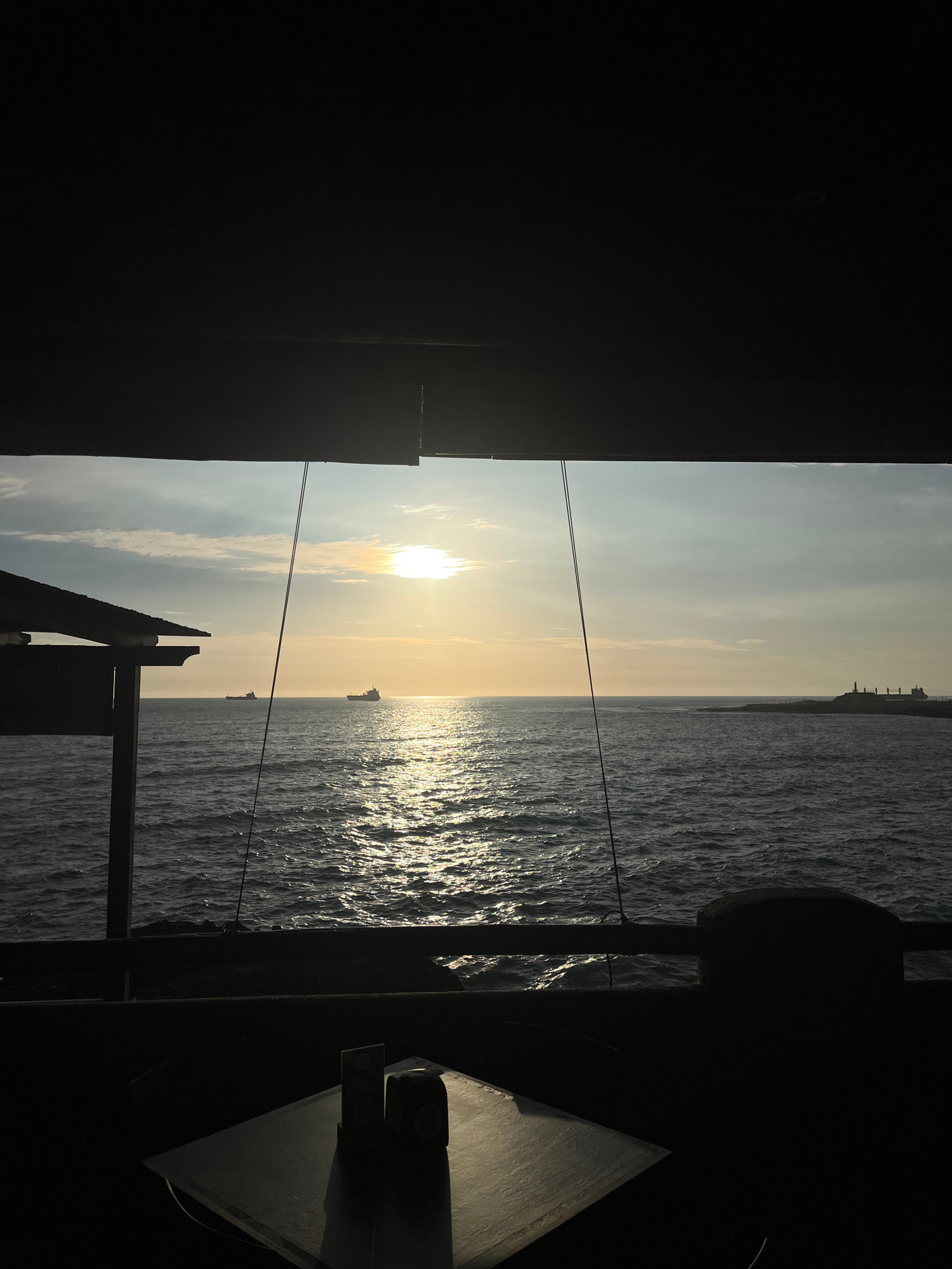 The image, viewed in landscape orientation, captures a serene coastal scene at either sunrise or sunset, looking out over a vast body of water, likely the Pacific Ocean near Arica, Chile. The sun, a b…read more