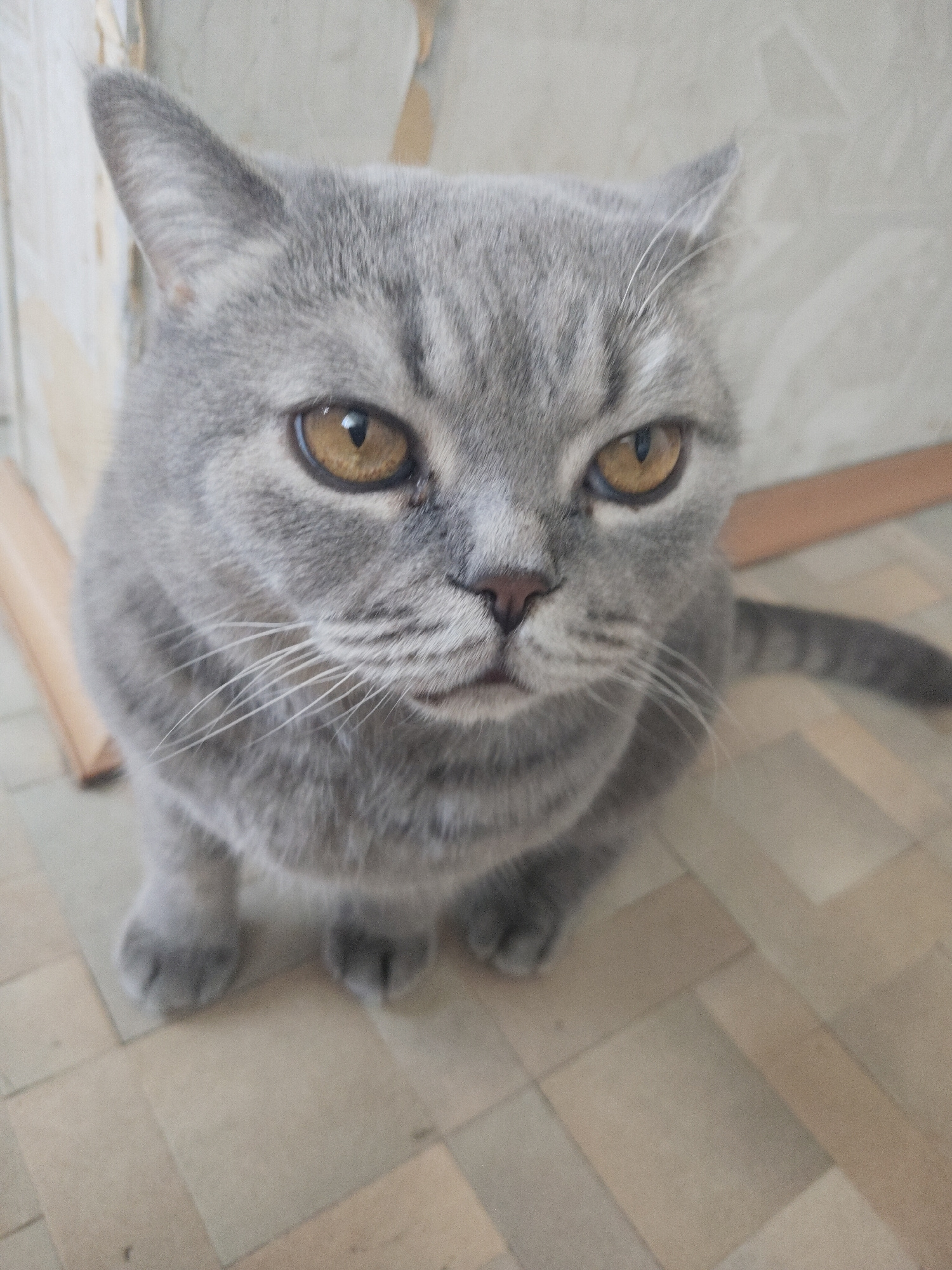An attentive grey domestic cat is the primary subject of this close-up, eye-level indoor photograph. The cat, possibly a British Shorthair due to its dense fur and round face, possesses striking large…read more