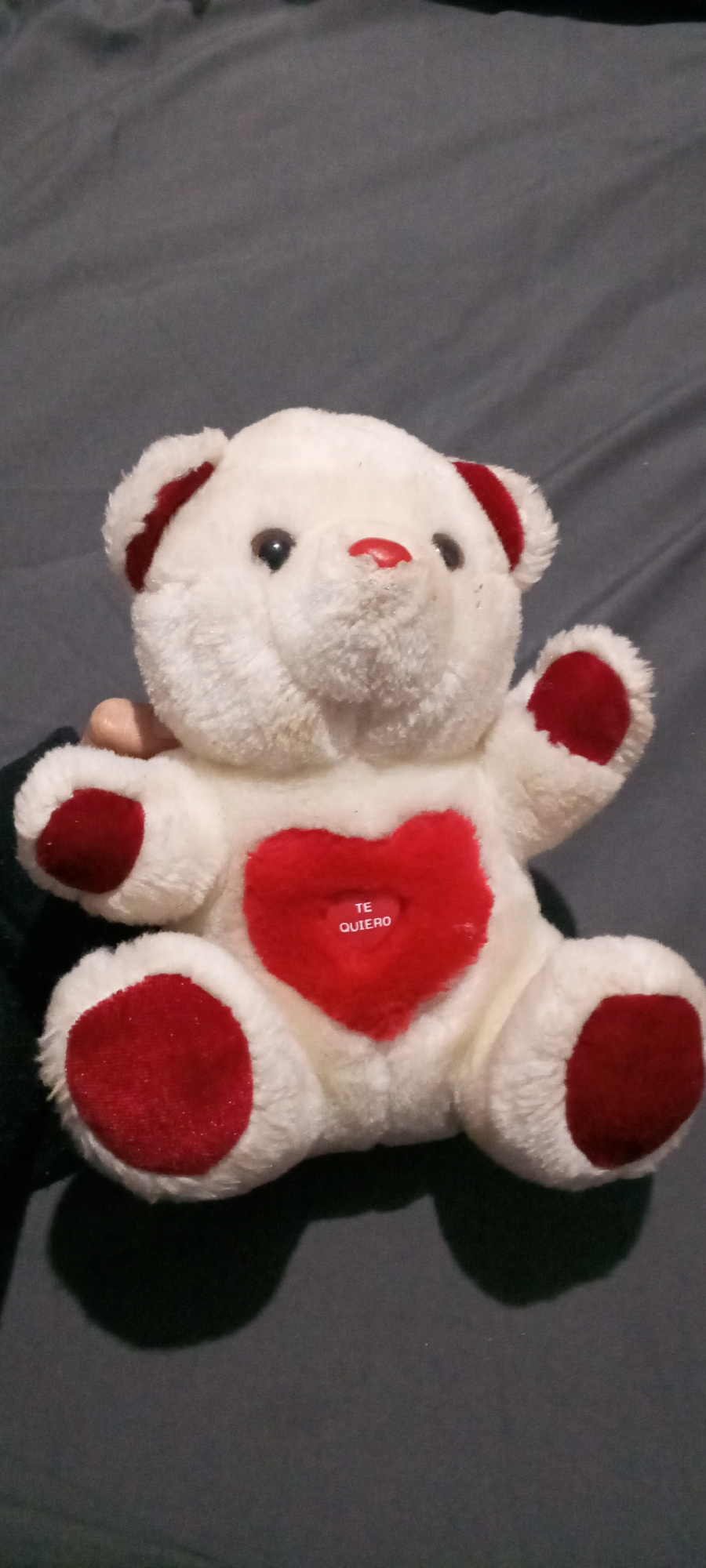 A white plush teddy bear with red accents is positioned against a dark gray fabric background. The bear has red patches on its ears, paws, and a heart on its chest. The phrase "TE QUIERO" is inscribed on the heart. The bear's nose is also red. The bear is being held by a person in their left hand. The image was taken in Juan Griego, Venezuela. | Open Wire