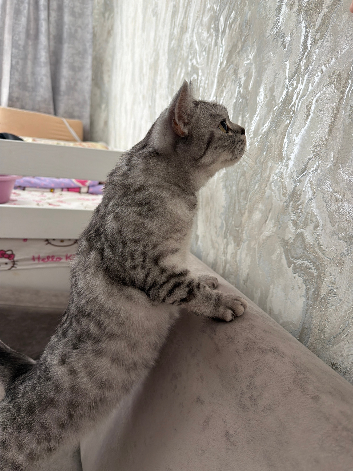 A gray tabby cat is climbing up a gray upholstered corner, possibly a sofa or chair. Its left forepaw is pressed against the upholstered surface, and its head is turned upward, looking toward a ceilin…read more