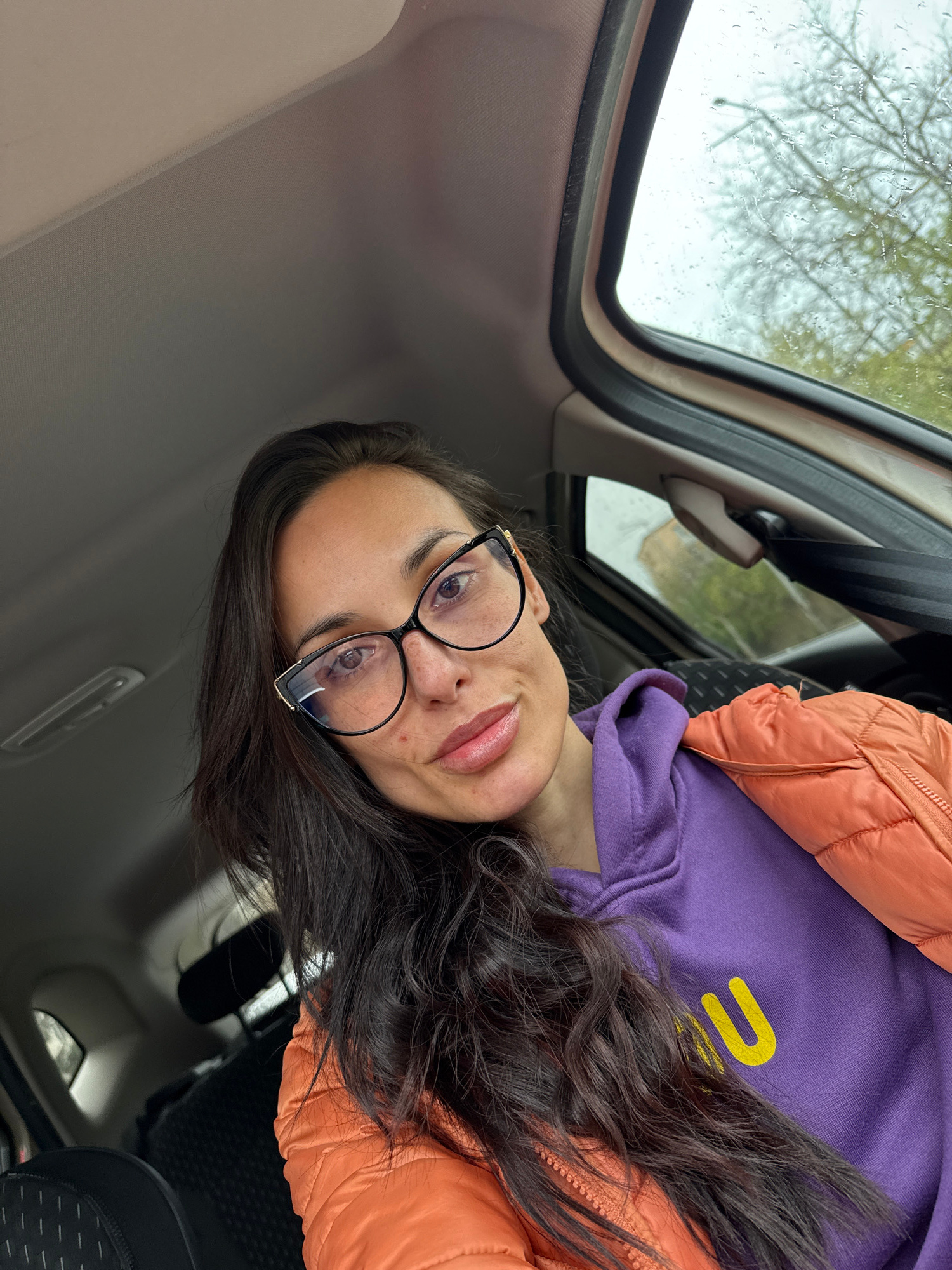 A woman is in the passenger seat of a car with a sunroof, wearing glasses, a purple hooded sweatshirt, and an orange jacket. It is daytime, possibly raining, as evidenced by water droplets on the sunr…read more