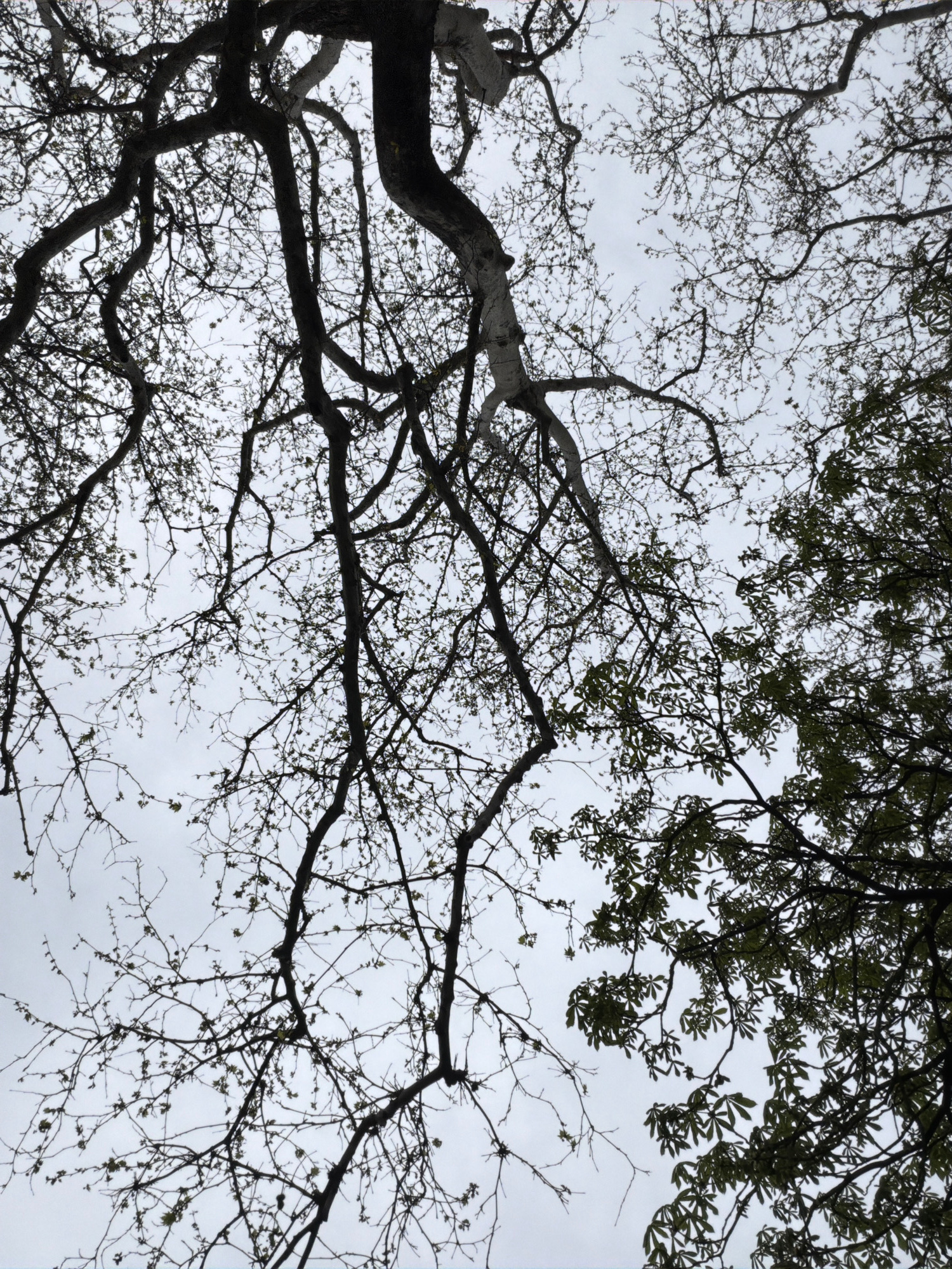 The image is a low-angle shot of tree branches against a grey sky. The branches are mostly bare, with a few small green leaves emerging. The scene is likely in Plovdiv, Bulgaria, but specific location…read more