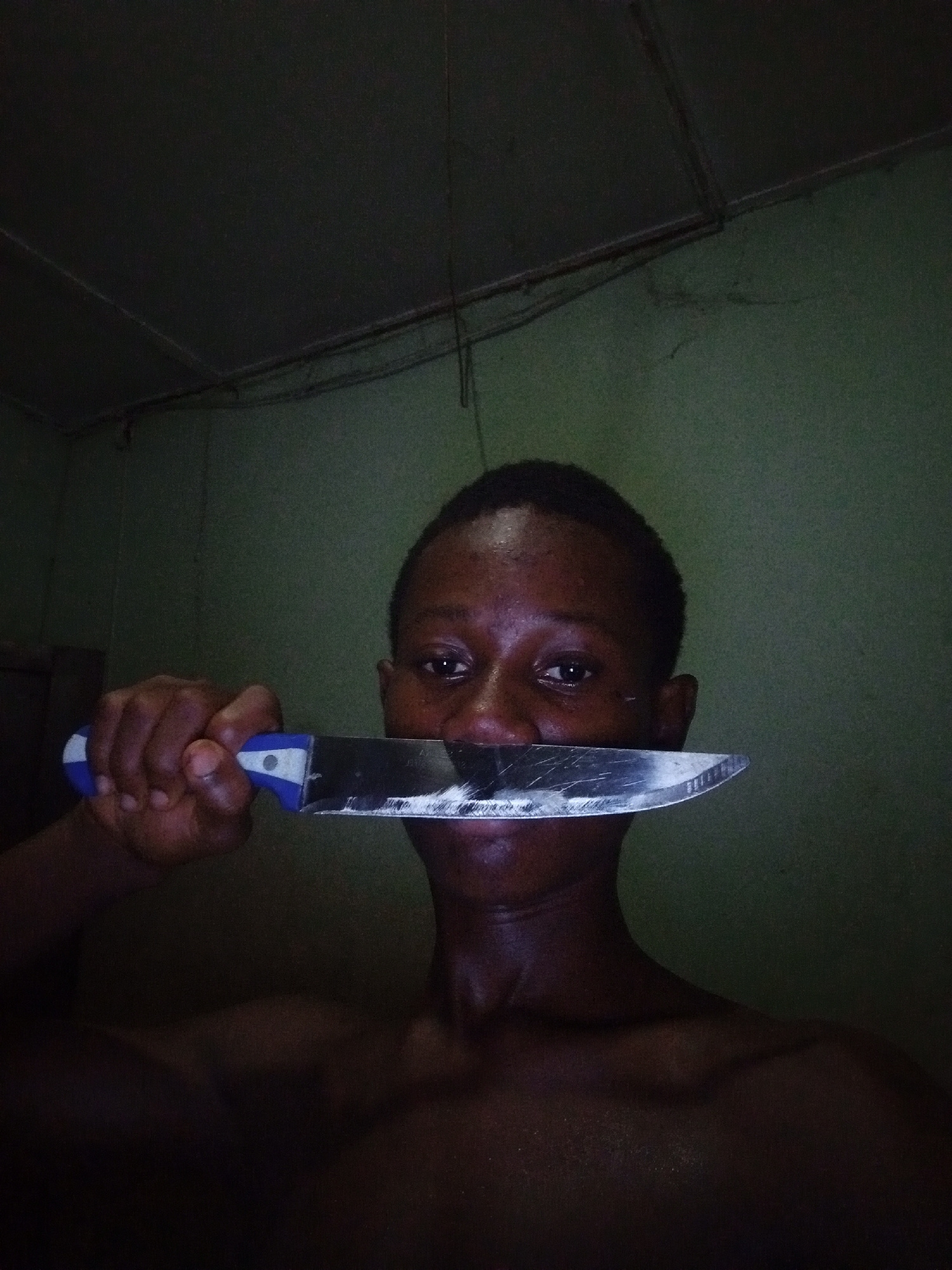 A man with dark skin stands indoors in a dimly lit room. He holds a kitchen knife with a blue and white handle horizontally in front of his mouth, obscuring his lips. The wall behind him is a muted green color. The ceiling appears to be dark and unfinished. No specific identifying details indicate the location is Ukwu-Abwa, Nigeria. The man's shoulders are visible and bare. His gaze is directly towards the camera. | Open Wire