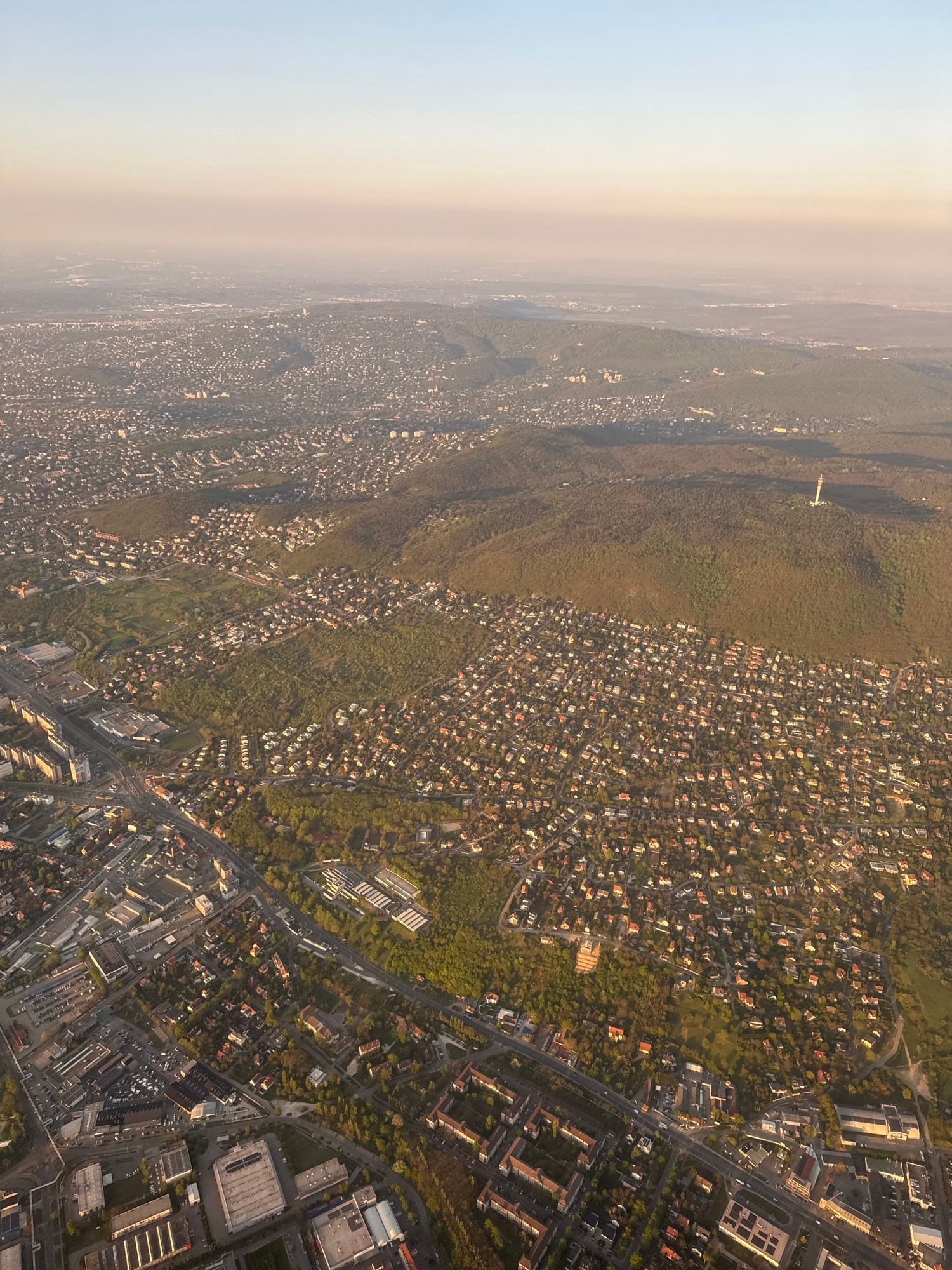 The image is an aerial view of a suburban area, possibly in the vicinity of Vecsés, Hungary. The photograph shows a dense concentration of residential buildings, a mix of houses with orange rooftops intermingled with greenery. There is also a clear distinction between densely populated residential areas and larger institutional or commercial buildings with rectangular rooftops, especially in the lower-right section of the photo. There appears to be a forest or green space, and a horizon with what looks like the edge of the city in a hazy atmosphere. The orientation of the image suggests that the photograph was taken from an airplane. | Open Wire