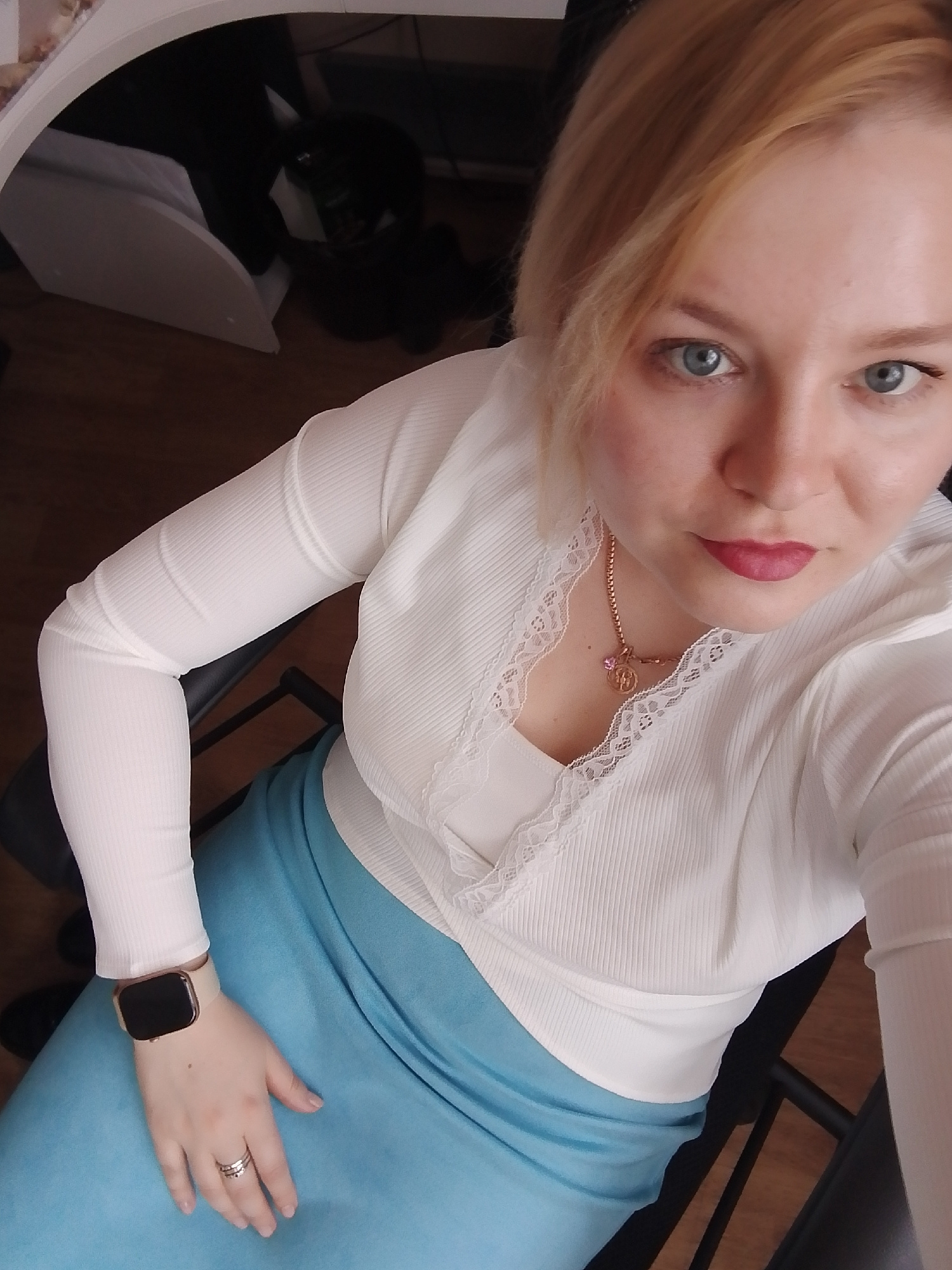 A blonde woman sits in a black chair, wearing a white, long-sleeved shirt with lace trim and a blue skirt. She wears a watch on her left wrist and a ring on her left hand. The background includes a wo…read more