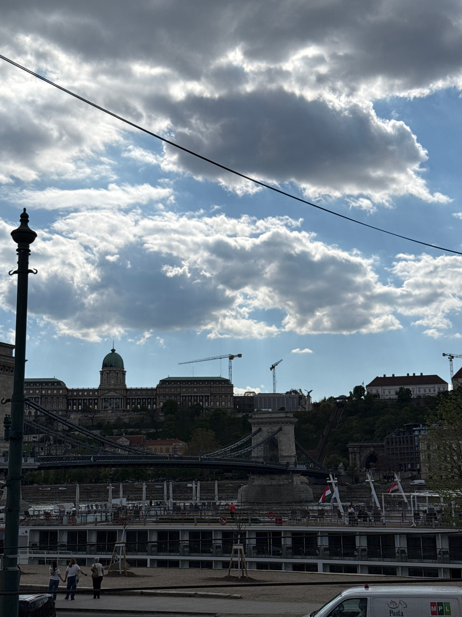 An outdoor, eye-level shot captures a vibrant cityscape along the Danube River in Budapest, Hungary, under a partly cloudy sky. The image appears rotated on its side, but, when viewed upright, reveals…read more