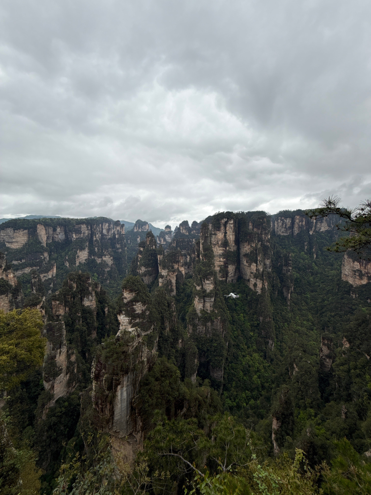 The image captures the Avatar Mountains in Luoguta, China. The mountains, characterized by steep, rocky cliffs covered in dense green vegetation, stretch into the sky under an overcast sky filled with…read more