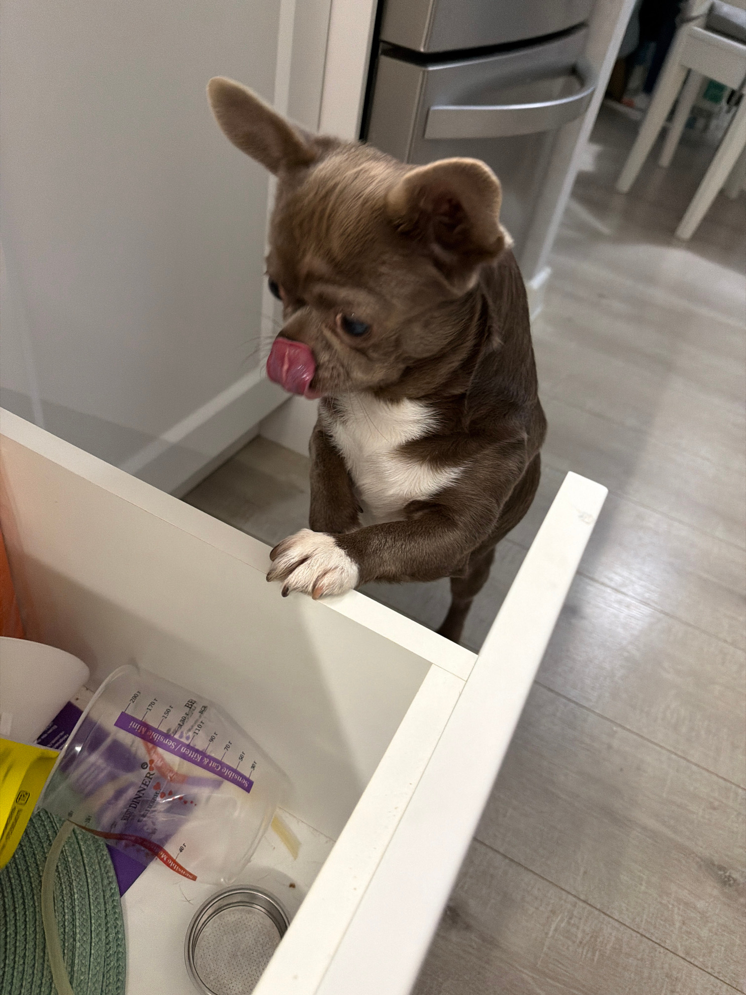 A brown and white dog with its tongue out is perched on the edge of an open white cupboard. The cupboard contains a measuring cup, a sieve, and other unidentified items. The location is not discernabl…read more