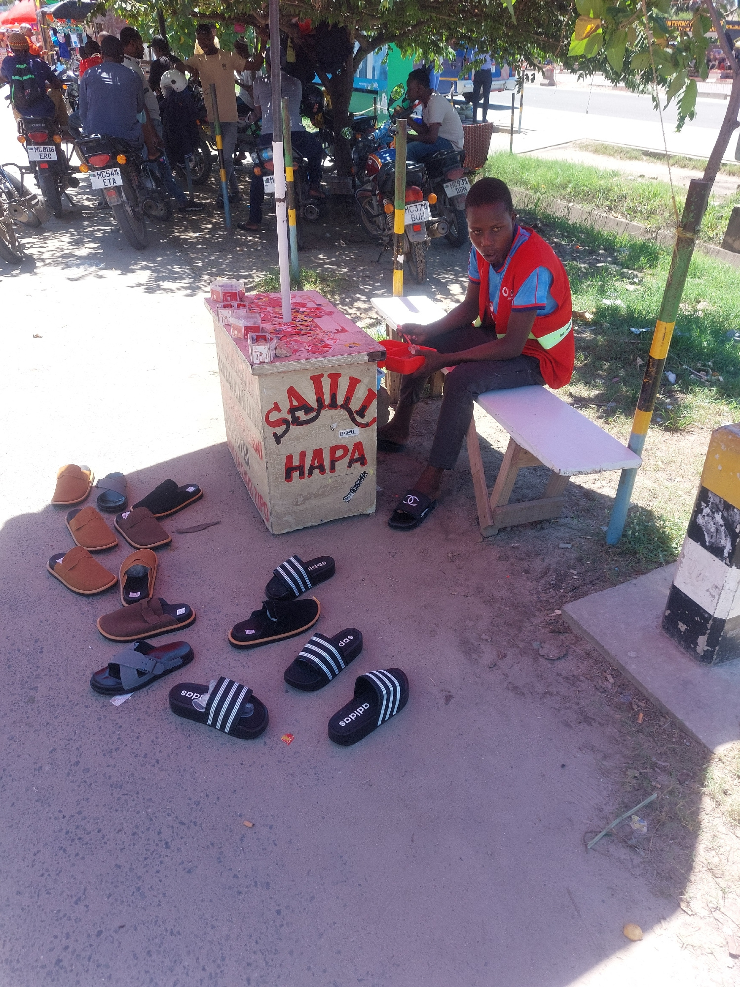 A youth sits on a bench at an informal roadside stall in Dar es-Salaam, Tanzania, near a curb. The stall displays sandals, with Adidas and similar styles scattered on the ground. The stall is painted…read more