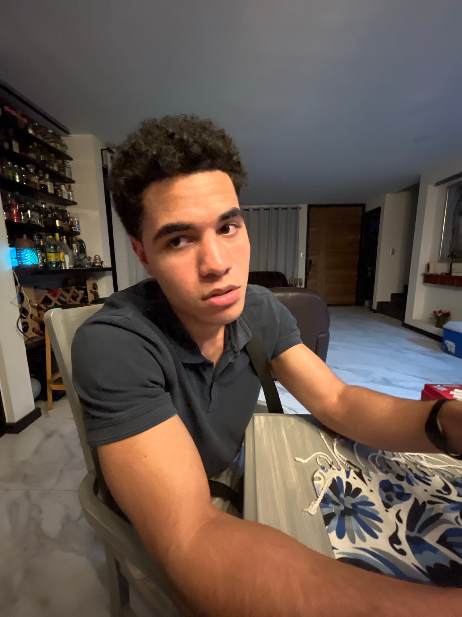 A man with curly dark hair is seated at a table. He is wearing a dark blue shirt. A patterned shirt with blue and white flowers is visible in the background. A liquor cabinet with numerous bottles is…read more