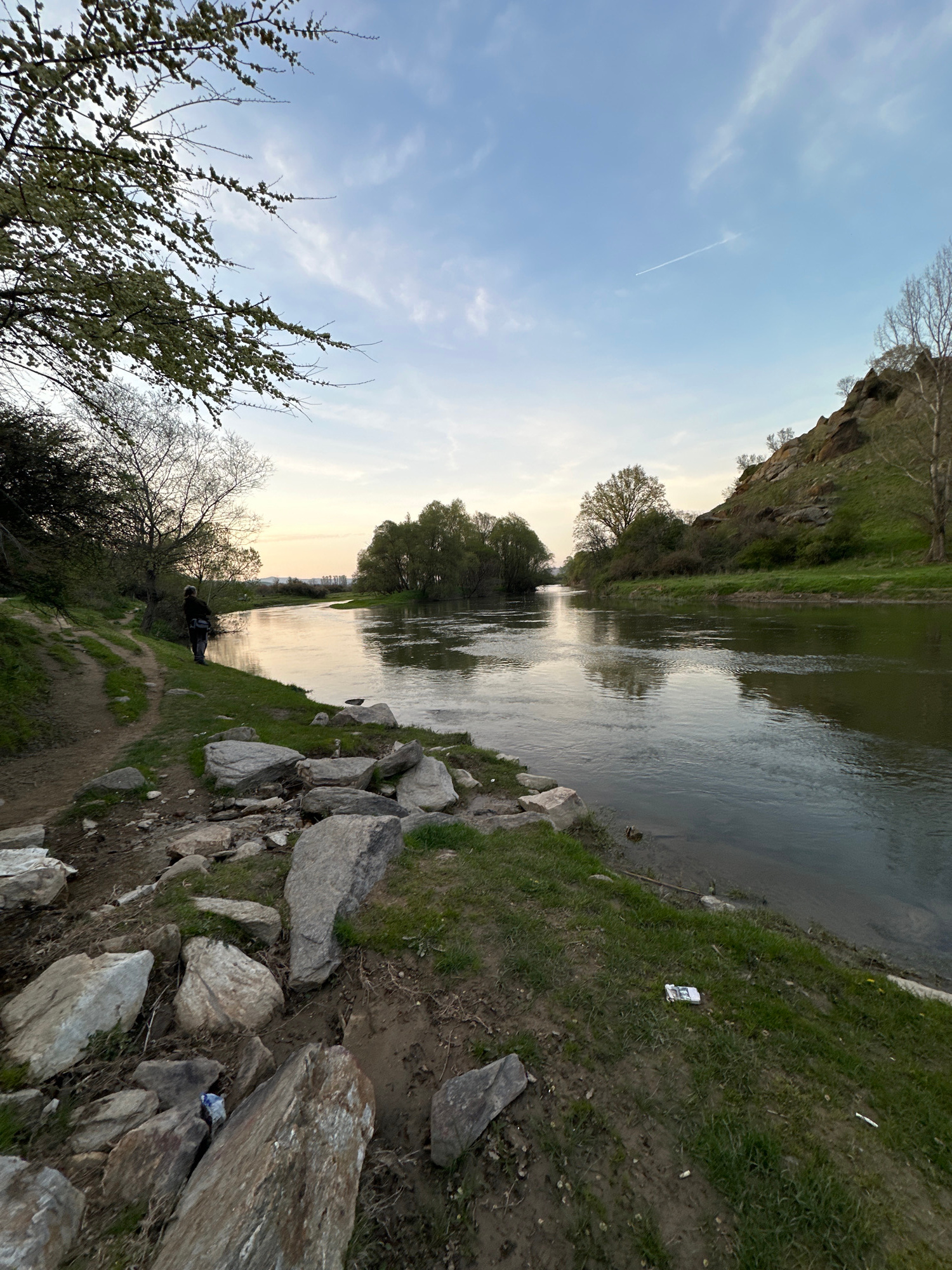 A landscape-oriented photograph depicts a river scene. The photo is taken at ground level, with the right side of the frame closer to the viewpoint and the left side receding into the distance. A bod…read more