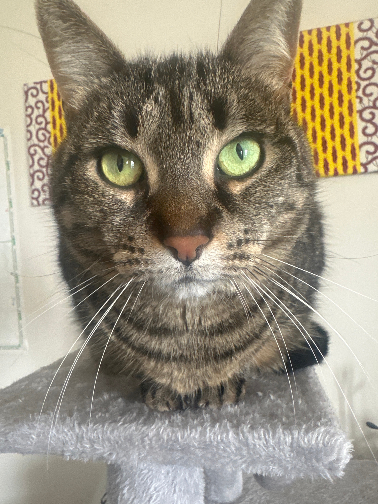 The image shows a close-up of a brown tabby cat's face with green eyes. The cat's head is tilted to the side. It has white whiskers and a pink nose. A grey, plush object, likely a cat tree, is visible…read more