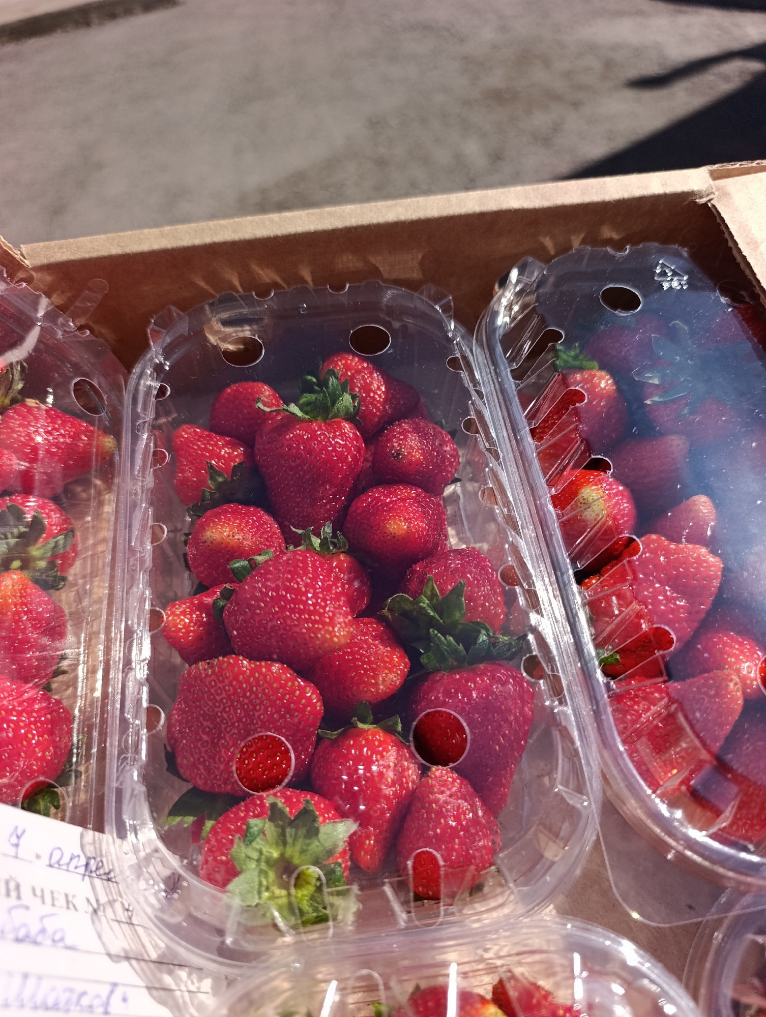 The image shows a cardboard box containing several clear plastic containers filled with fresh strawberries. The strawberries are bright red and have green stems. One container has a handwritten note a…read more
