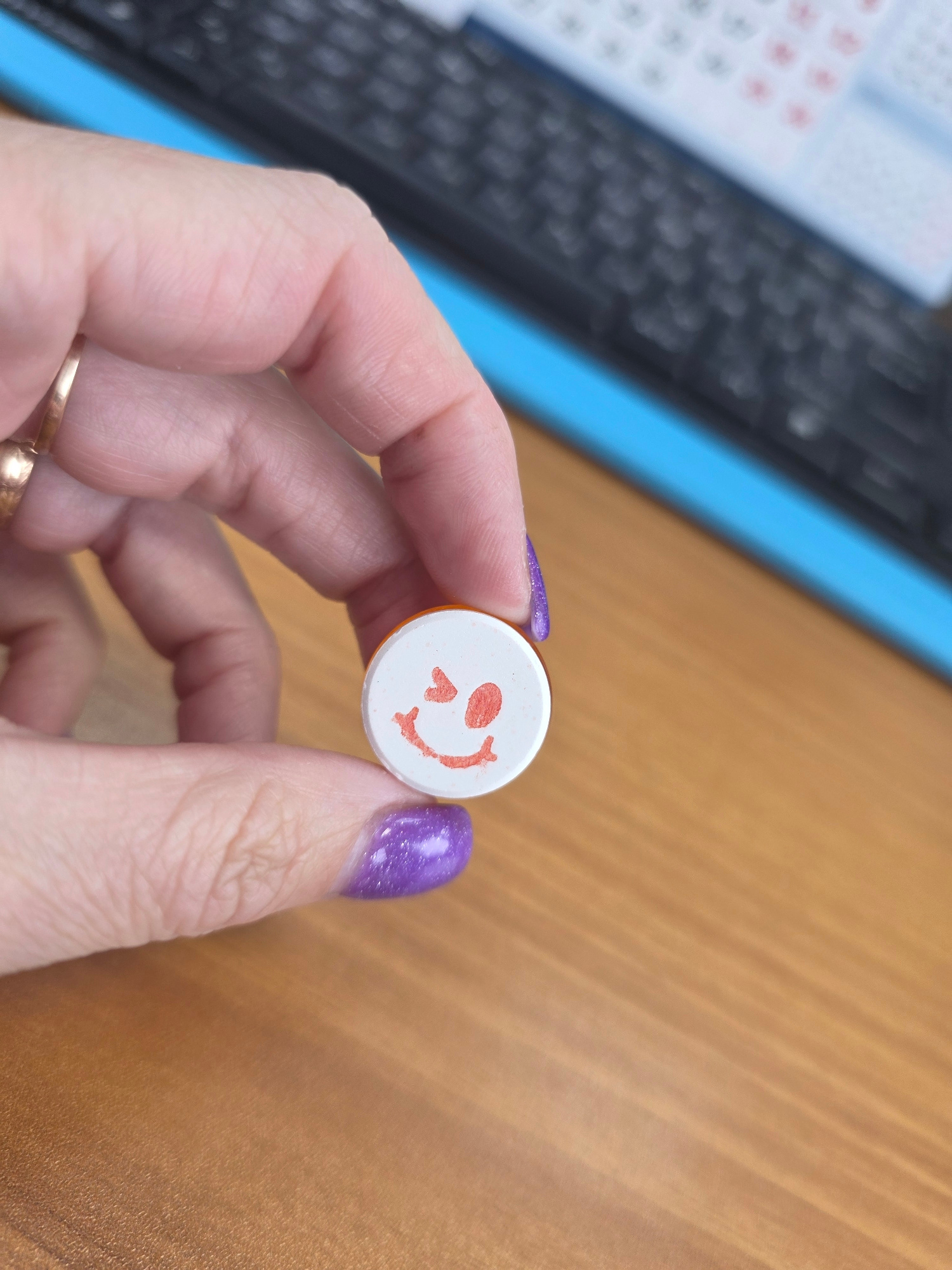 A hand holds a white, circular object with a red smiling face drawn on it. The hand has a gold ring on one finger and the fingernails are painted purple with glitter. The background is a wooden surfac…read more