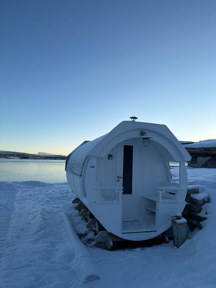 The scene depicts a white, barrel-shaped structure, identified as a sauna or cabin, situated on a snow-covered bank beside a body of water in Harstad, Norway. The structure features a dark, rectangula…read more