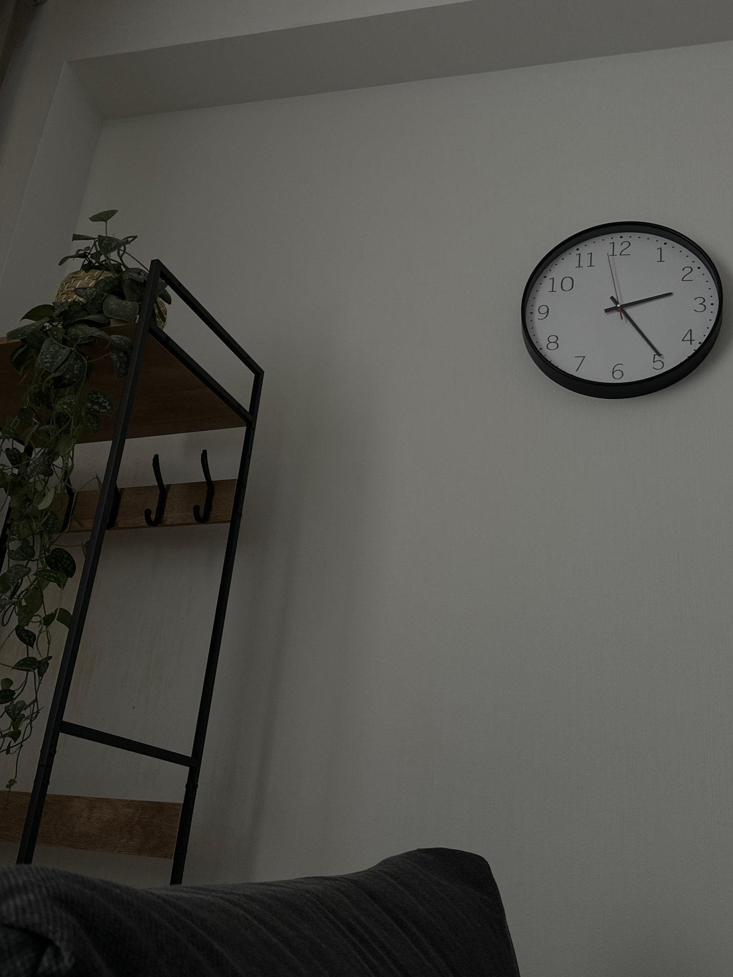 The image shows a high-angle view of an interior space. A round black clock with white numbers is mounted on a plain white wall, displaying a time of approximately 1:22. Below and to the right of the…read more