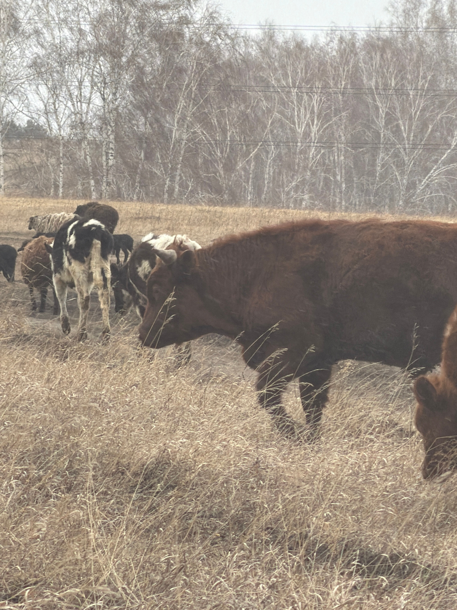 The image depicts a rural scene, possibly on the outskirts of Krasnoyarsk, Russia. It features a herd of cattle grazing in a field of dry grass. In the background, there is a line of bare trees, poten…read more