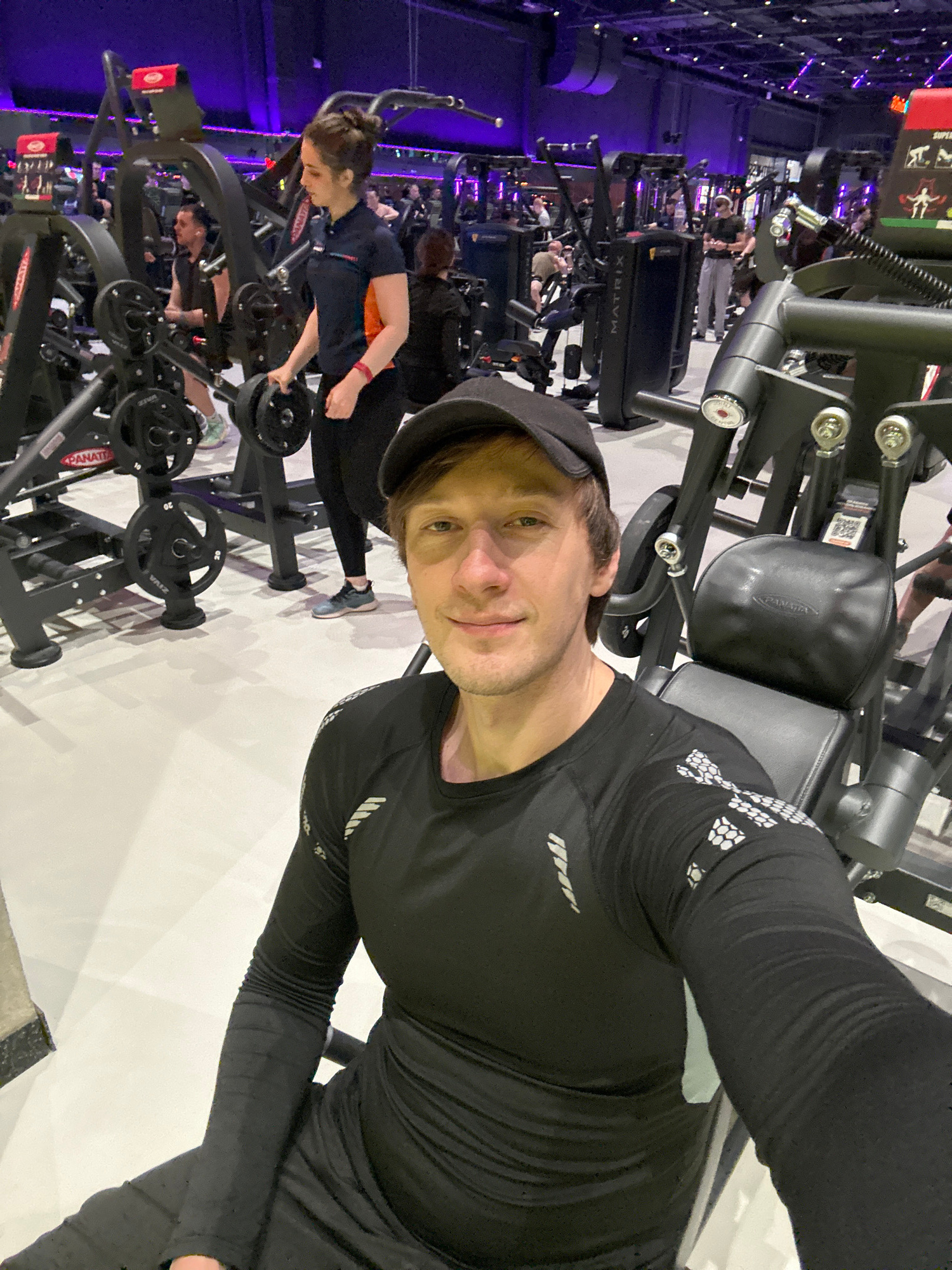 The image captures a selfie of a man at a gym in Murino, Russia. The man, wearing a black long-sleeved shirt with hexagonal patterns on the sleeves and a white logo (possibly "MYPROTEIN"), and a black…read more