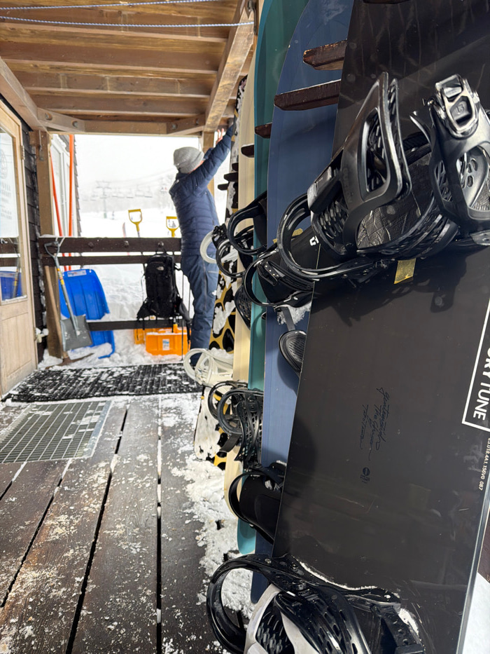 The image shows multiple snowboards stacked on a wooden deck covered in snow. A person wearing a gray hat and blue jacket lies stretched underneath the boards, near a wooden building frame. Orange and…read more