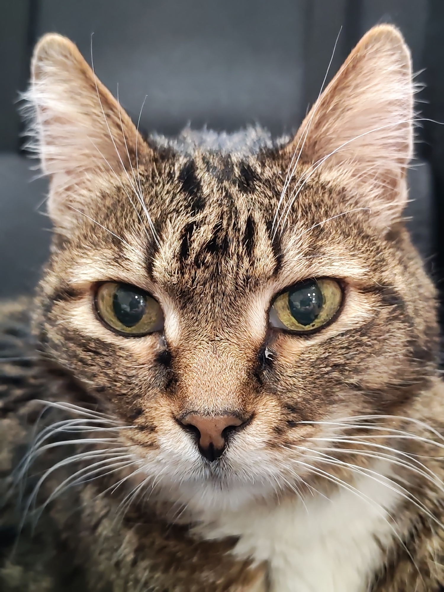 Close-up portrait of a brown tabby cat. The cat's face is symmetrical, with almond-shaped green eyes, a pink nose, and white whiskers. The background is out of focus and dark, possibly a black couch.…read more