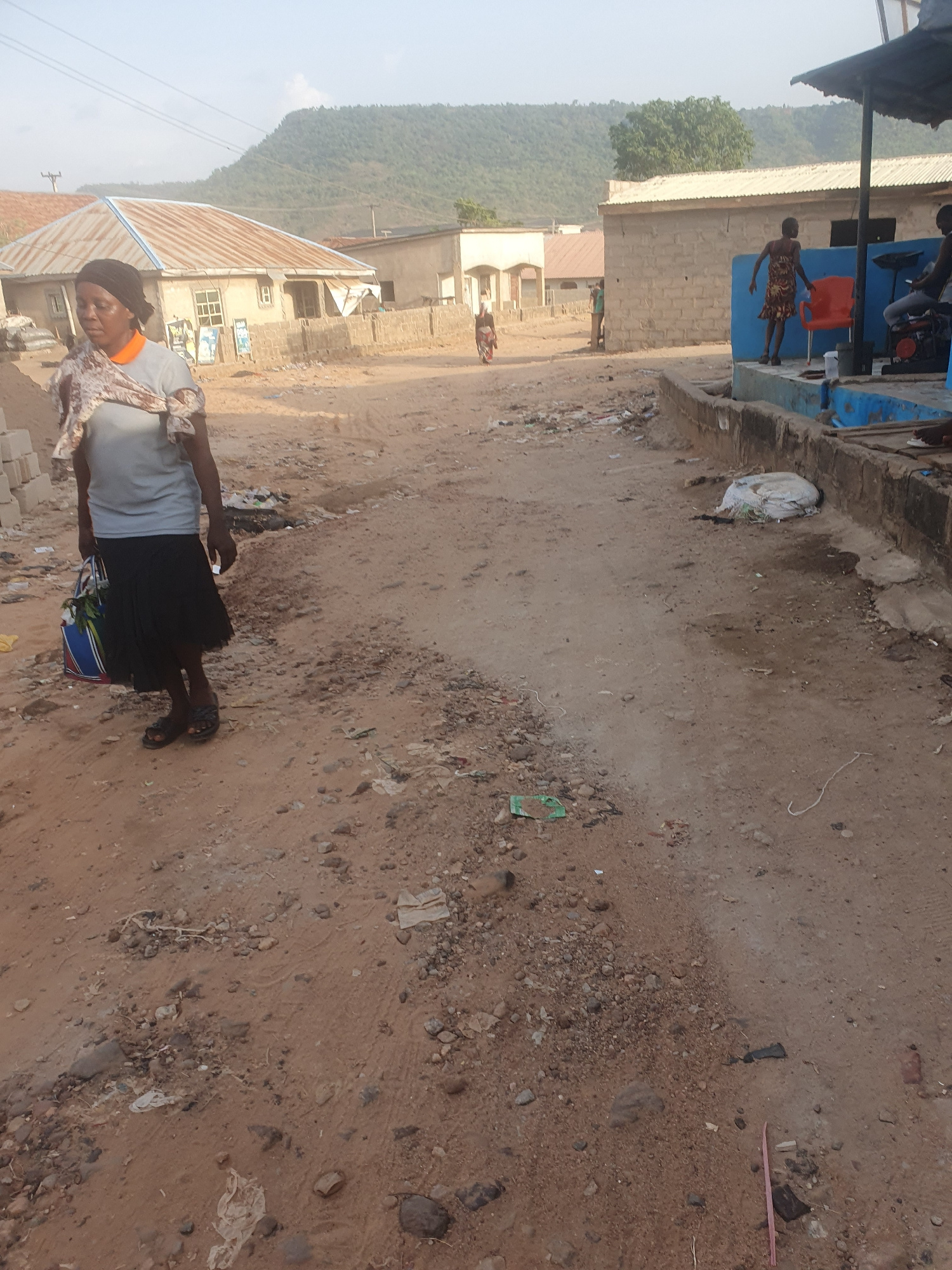A woman wearing a gray shirt and a black skirt is standing on a dirt road in Lokoja, Nigeria. The road is lined with buildings and a mountain can be seen in the background. There is litter on the grou…read more