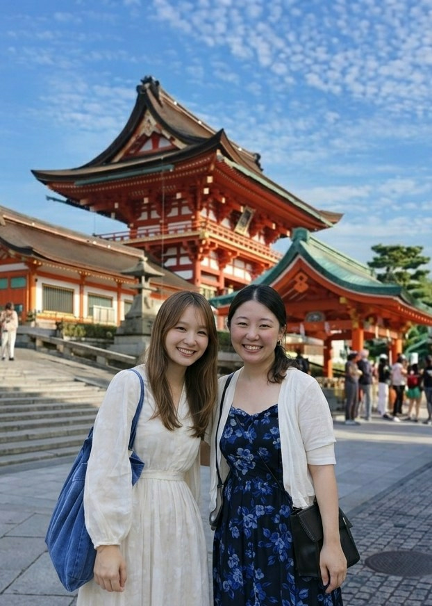 Two East Asian women smile directly at the camera in a posed outdoor portrait. The woman on the left has long brown hair, wears a white long-sleeved dress, and carries a blue tote bag over her left sh…read more