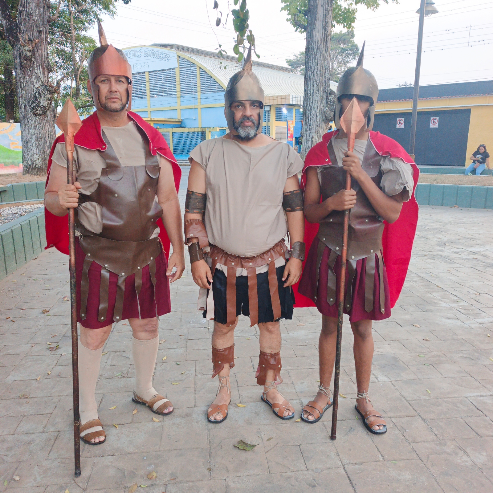 Three individuals in ancient soldier costumes are standing upright on a paved outdoor surface in Tinaquillo, Venezuela, with the "Gimnasio Cubierto Federico Sanchez" building visible in the background…read more