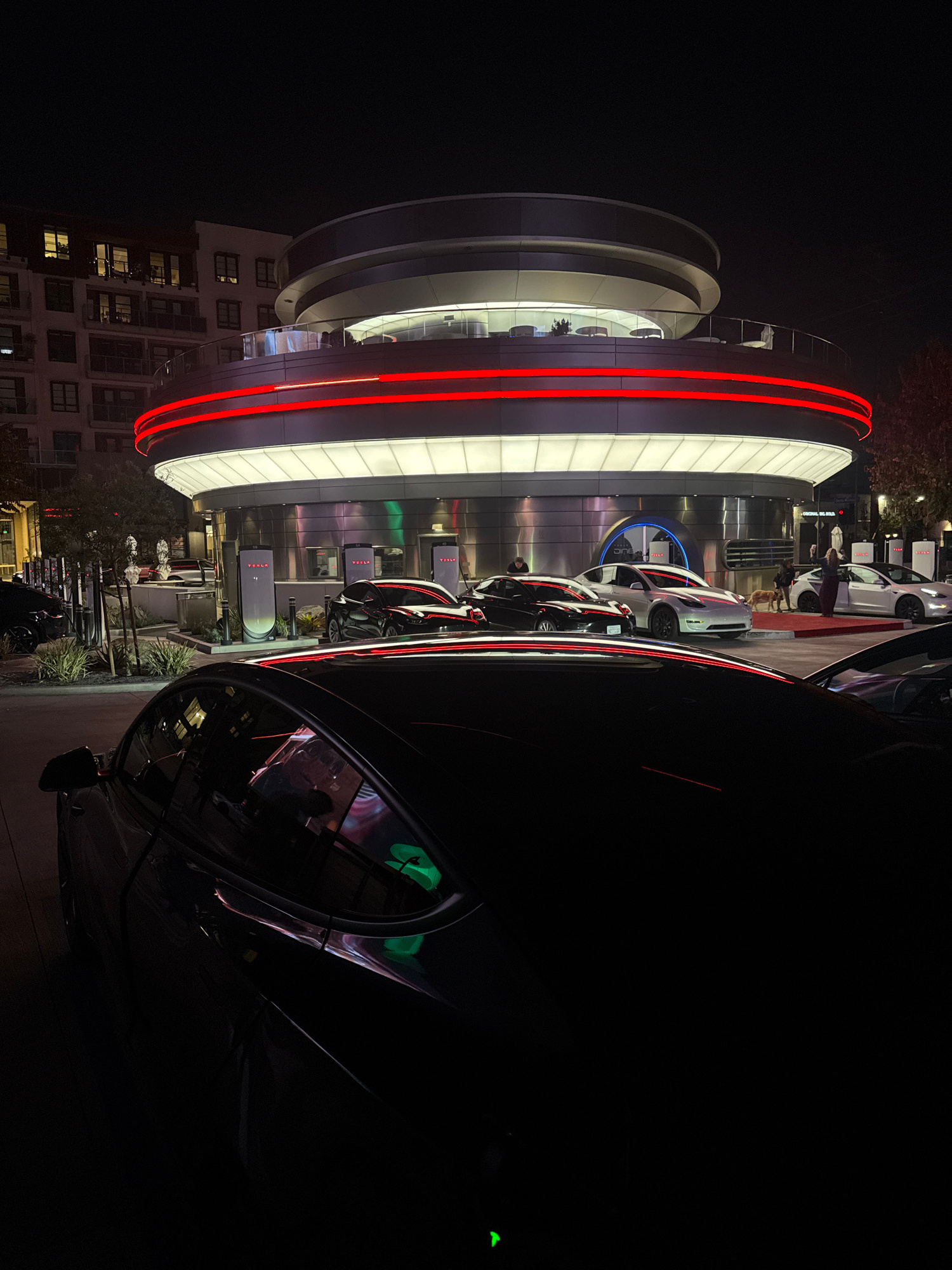 The image shows a Tesla charging station in West Hollywood, United States, at night. The station has a futuristic design with illuminated, concentric rings that dominate the left side of the frame. Re…read more