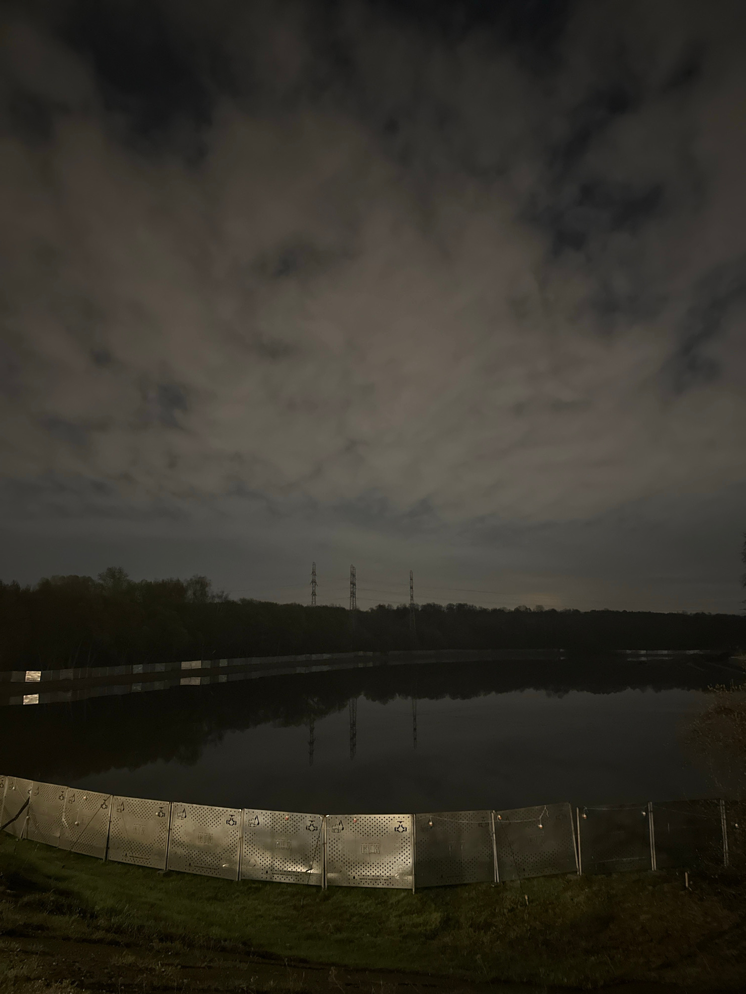 The image depicts a landscape at night. A canal or river runs through the center of the image, bordered by trees and foliage. Power lines are visible in the distance, crossing over the water. To the r…read more
