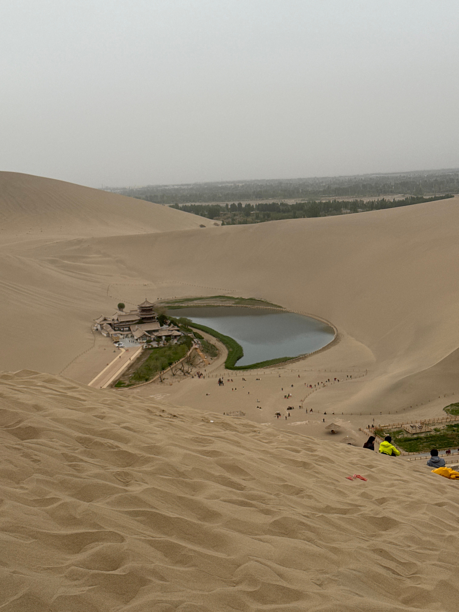 The image presents a view of Crescent Lake in Dunhuang City, China. The lake is a crescent-shaped body of water nestled amidst sand dunes. Buildings and vegetation are located along one edge of the la…read more