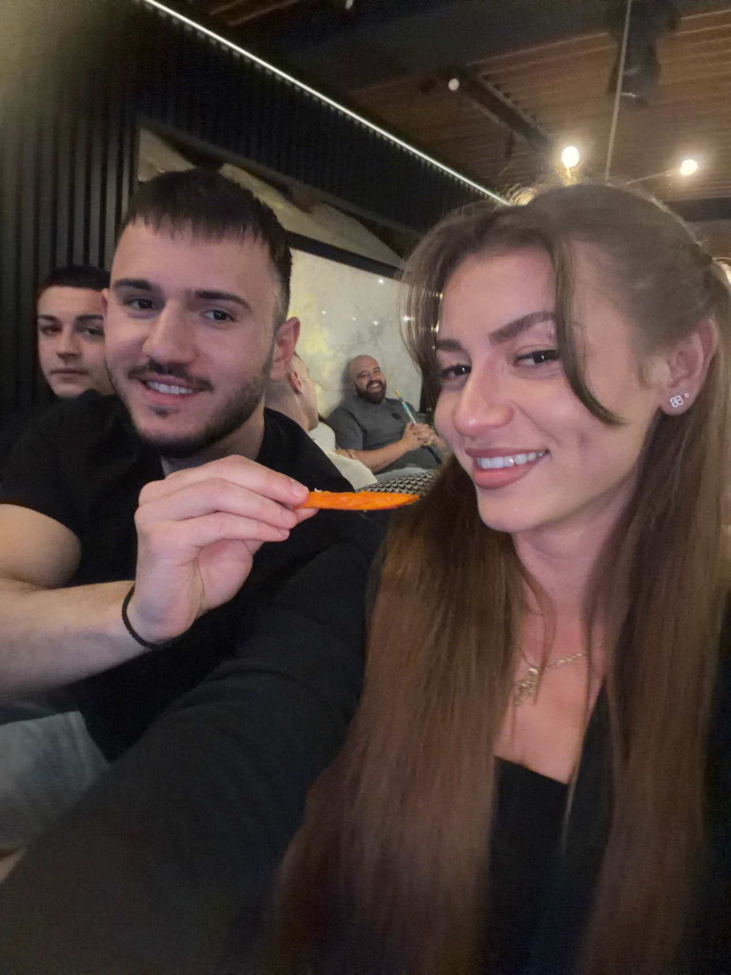 Here is a description of the image: A selfie-style shot of three people. A woman with long brown hair wearing a dark top and a necklace is at the top of the frame. Below her, a man with short dark ha…read more