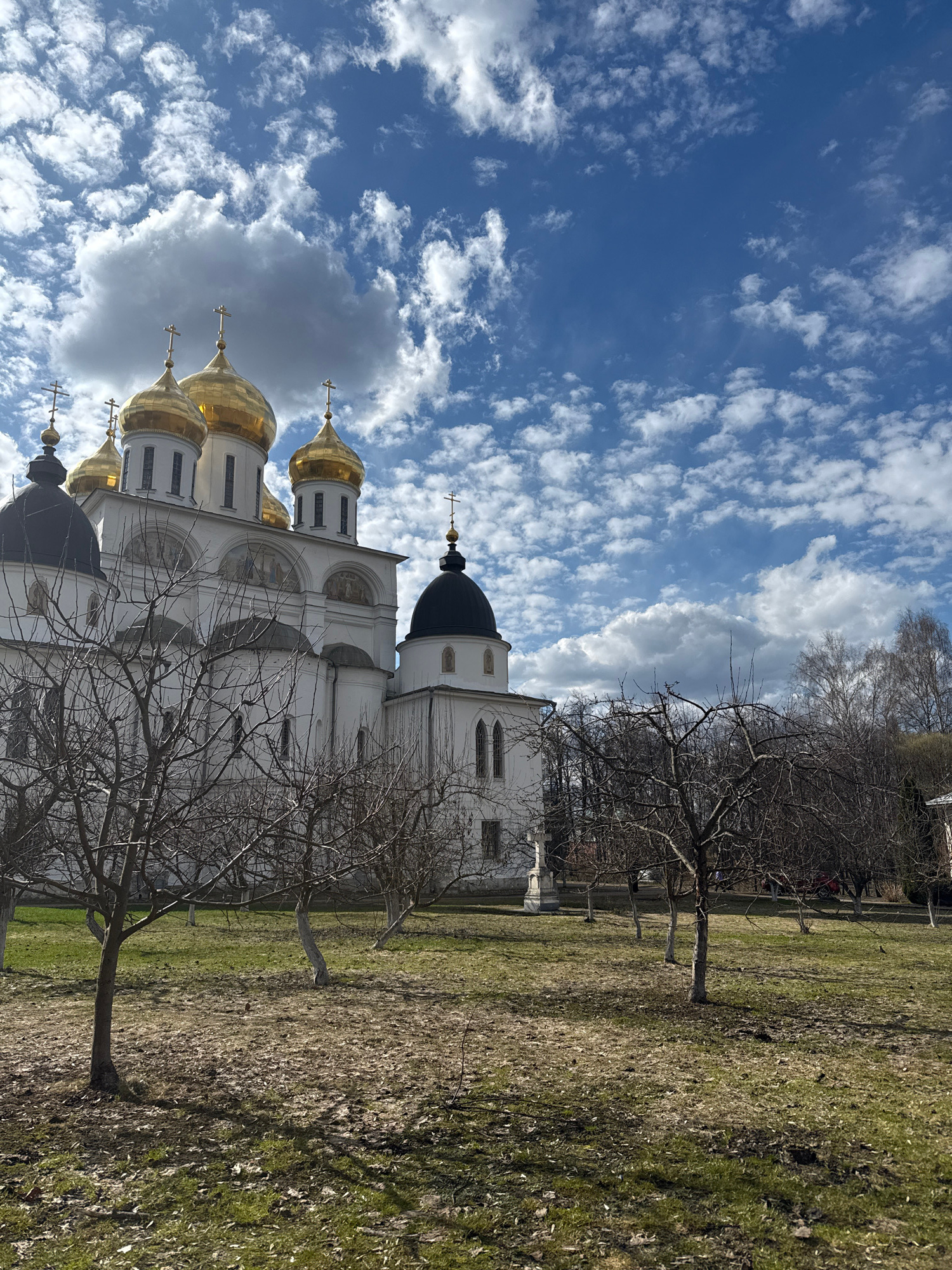 The image depicts a white building with multiple golden domes and black domes under a blue sky with scattered clouds. Bare trees stand in the foreground. The building is situated in a grassy area with…read more