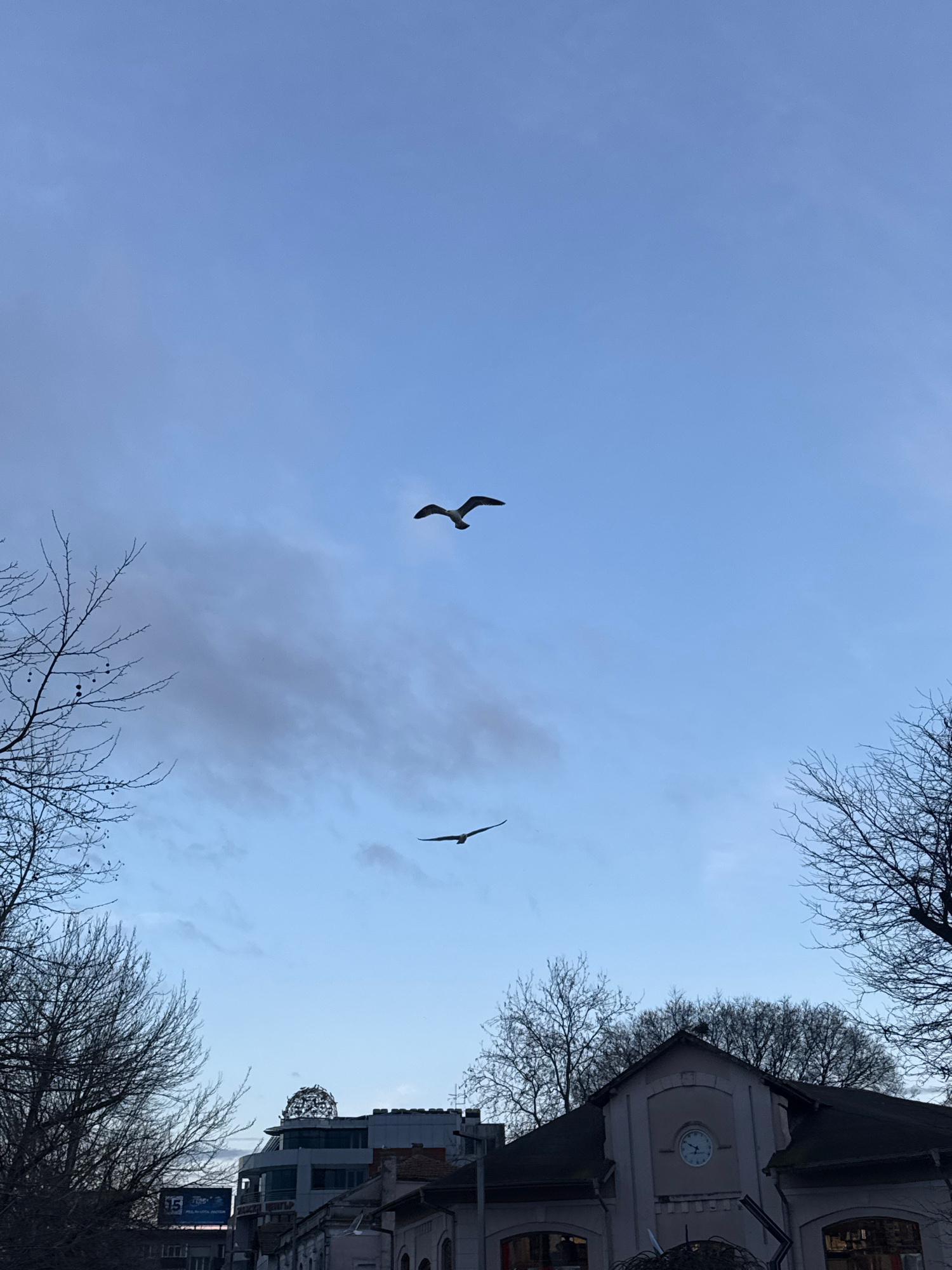 The photograph is taken in Burgas, Bulgaria. The angle of the image is looking up into the sky. The sky is a blueish-grey color with some scattered clouds. There are two birds flying in the sky. The b…read more