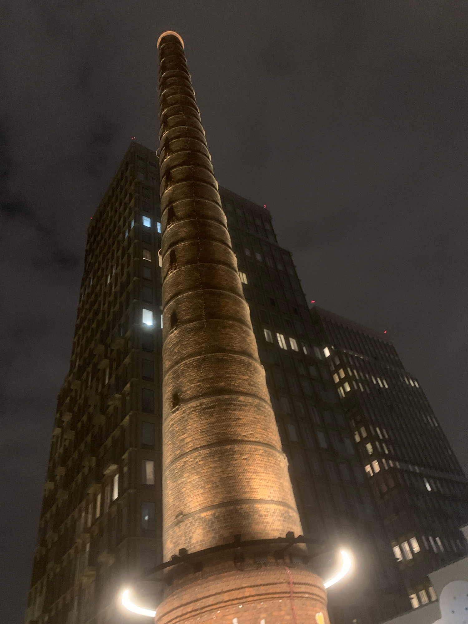 A low-angle shot at night depicts a tall chimney and a building in Moscow, Russia. The chimney extends horizontally across the frame, tapering from right to left. It is illuminated by two lights on thβ¦read more
