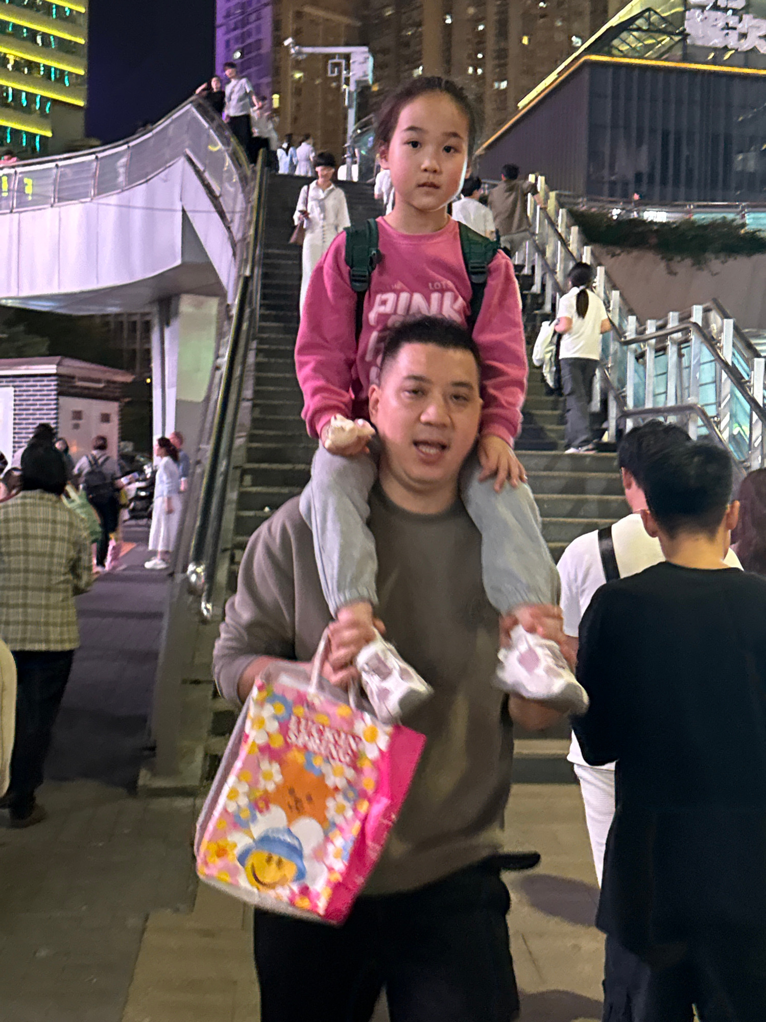 This image, likely captured in Yuzhong District, China, depicts a father carrying a young girl on his shoulders, facing the camera. The man, with short dark hair, wears a grey or olive-colored long-sl…read more