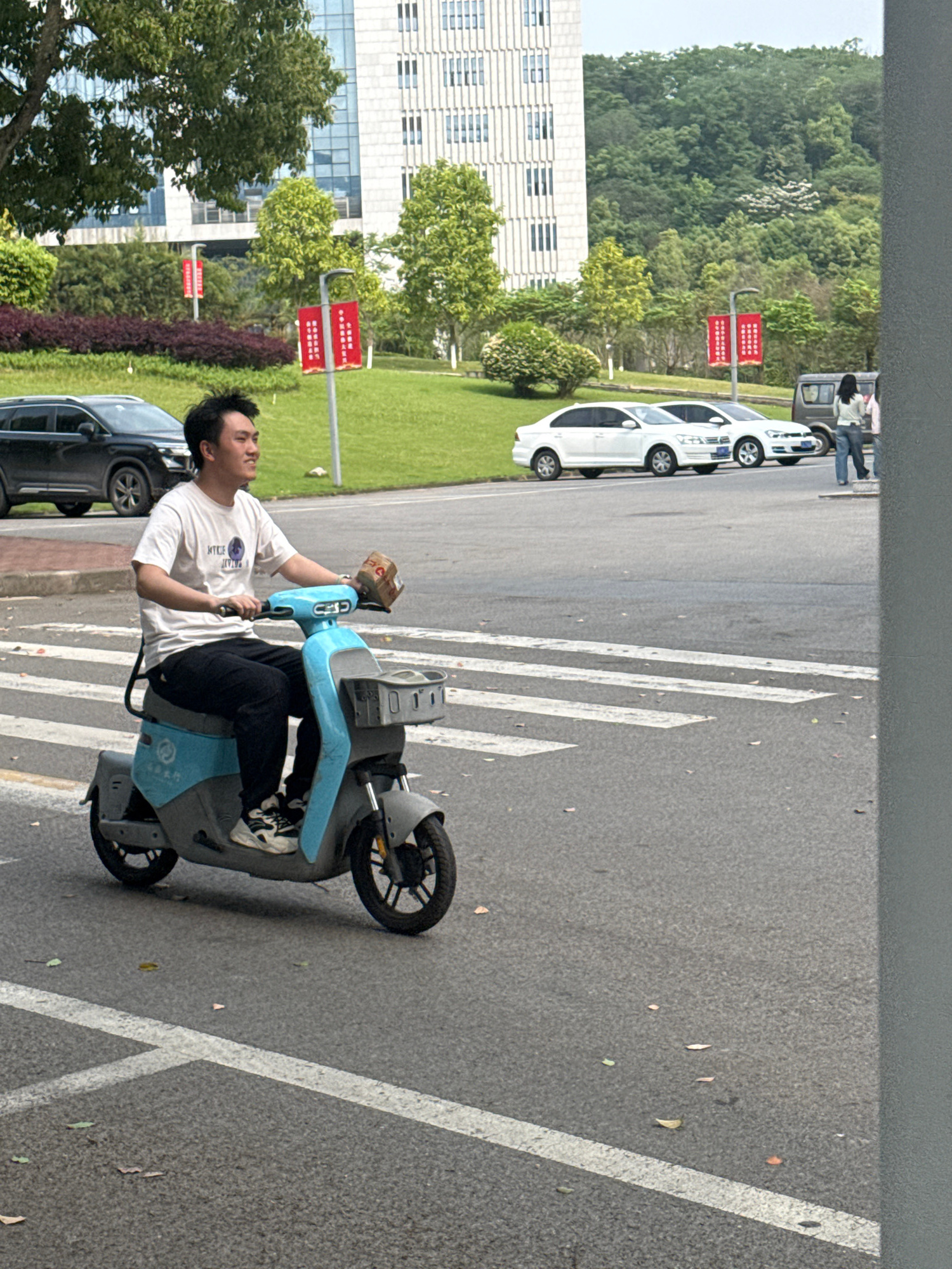 A man is riding a light blue electric scooter on an asphalt road. He is wearing a white t-shirt and black pants and is holding a small cardboard box. The road has white painted lines marking crosswalk…read more
