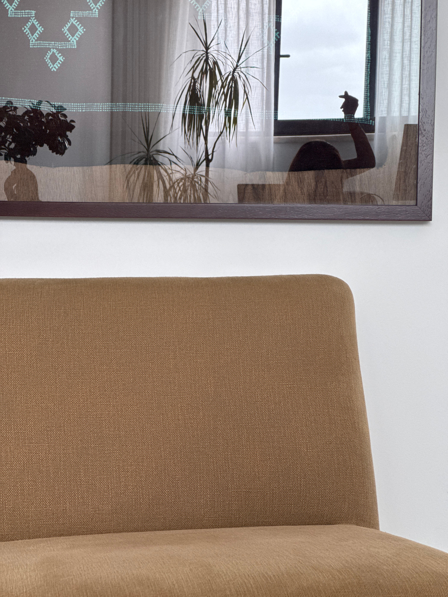 The image presents a dual composition featuring a framed object on the left and a textured upholstered furniture piece on the right, against a plain white wall. On the left, a large, dark brown woode…read more