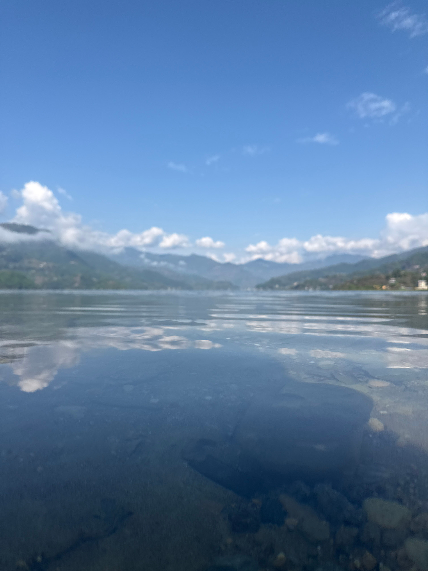 The image shows a scene at Phewa Lake in Pokhara, Nepal, seen from an underwater perspective. The foreground features rocks and pebbles submerged in the lake's clear water. The surface of the water re…read more