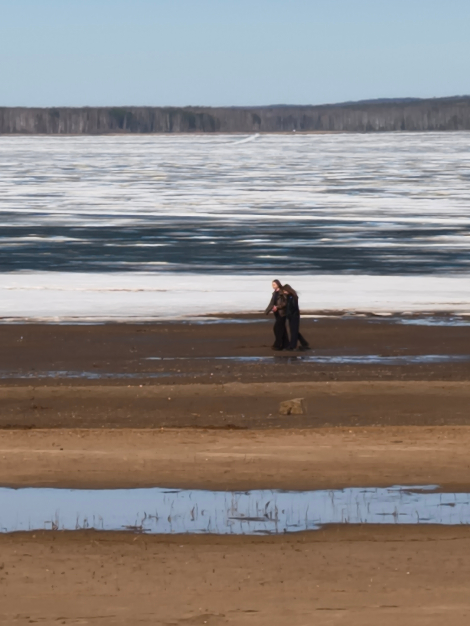 The photograph depicts a landscape with two people walking along a shoreline. The foreground features a sandy beach with a shallow pool of water reflecting the sky. The middle ground shows a partially…read more