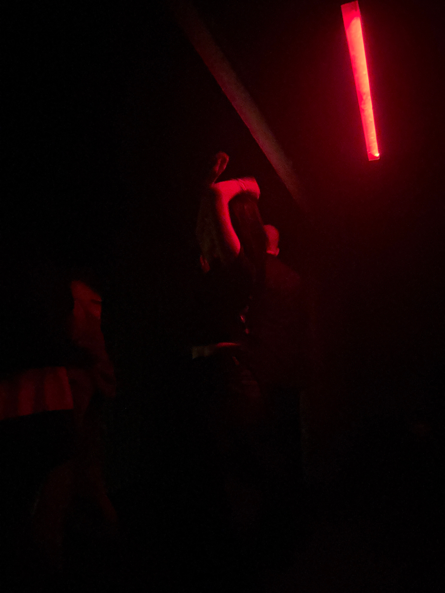 The image shows a dark interior illuminated by a red light source, likely a neon sign or LED strip, positioned in the upper left corner. A person's hands are visible, holding an unidentified object. T…read more