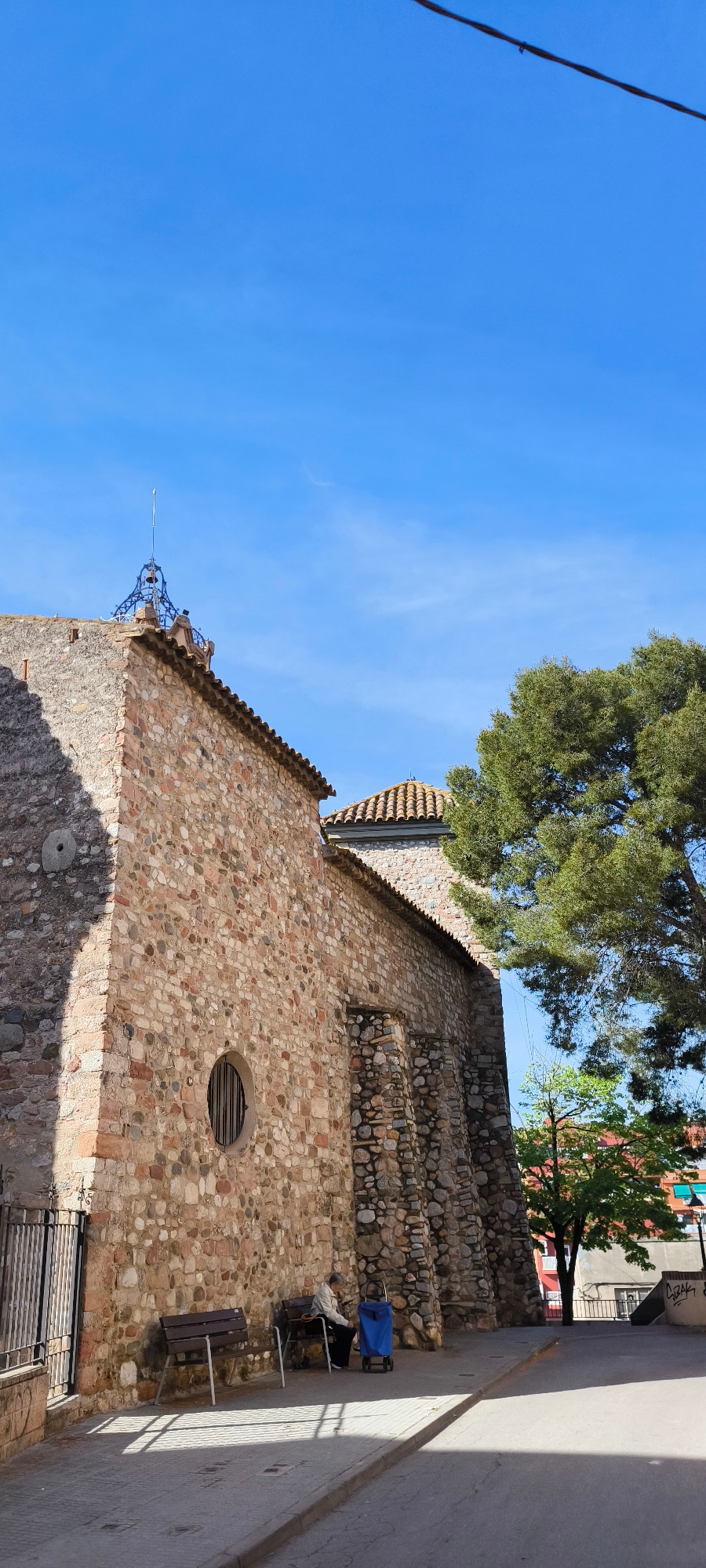 The photograph depicts a building in Ripollet, Spain, constructed of irregular stones and featuring a tiled roof. A small, barred, circular window is visible on the left side of the building. To the r…read more