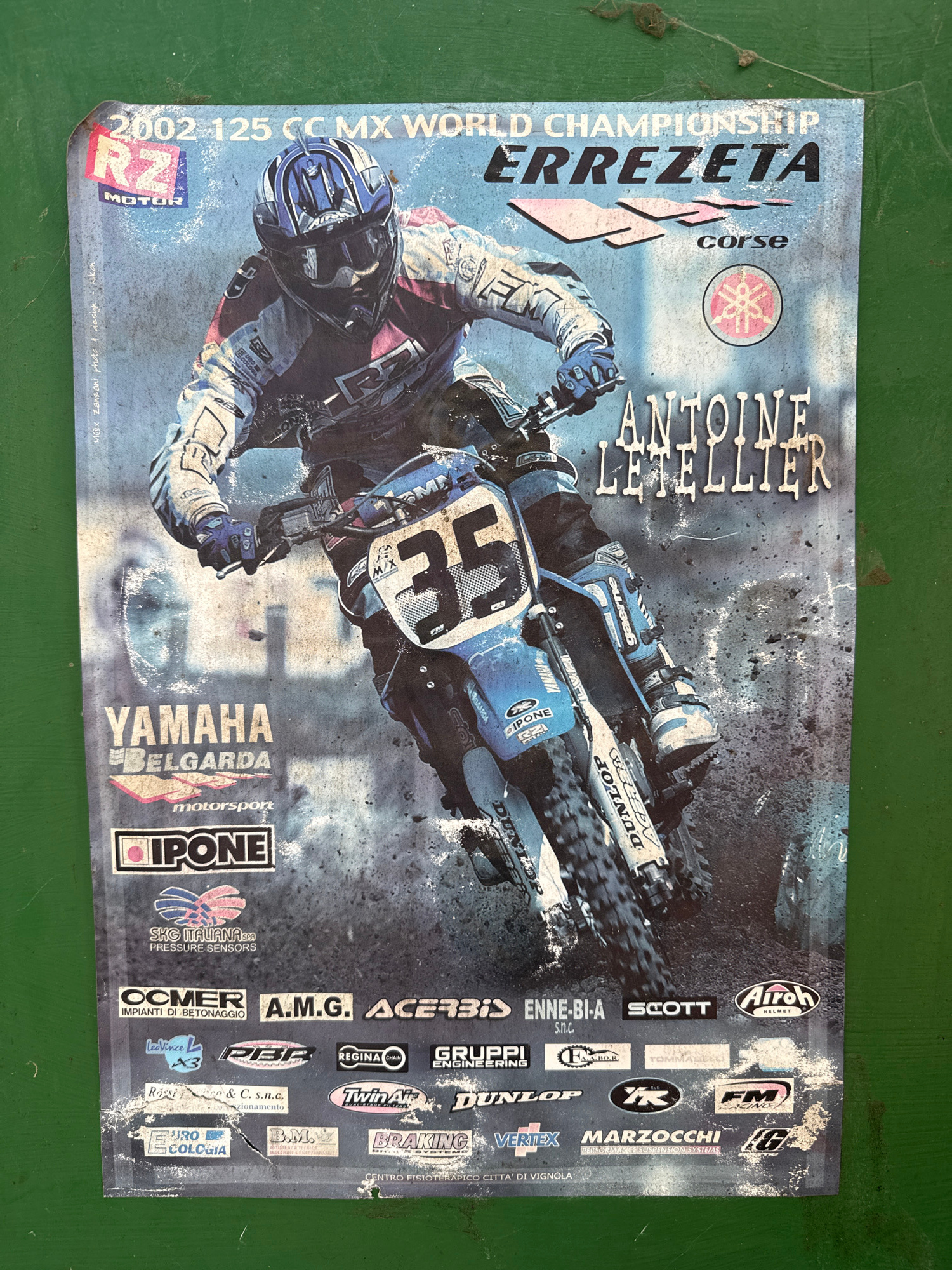 Here is a description of the image: The image is of a motocross poster advertising the 2002 125cc MX World Championship Errezeta, featuring rider Antoine Letellier. The poster displays various sponso…read more