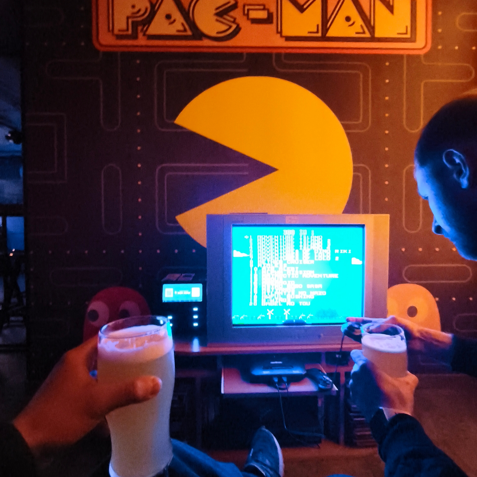 Two people are sitting in an arcade-style room, possibly a bar or entertainment venue in Hrodna, Belarus, in front of a CRT television screen displaying an 8-bit style game. The background wall featur…read more