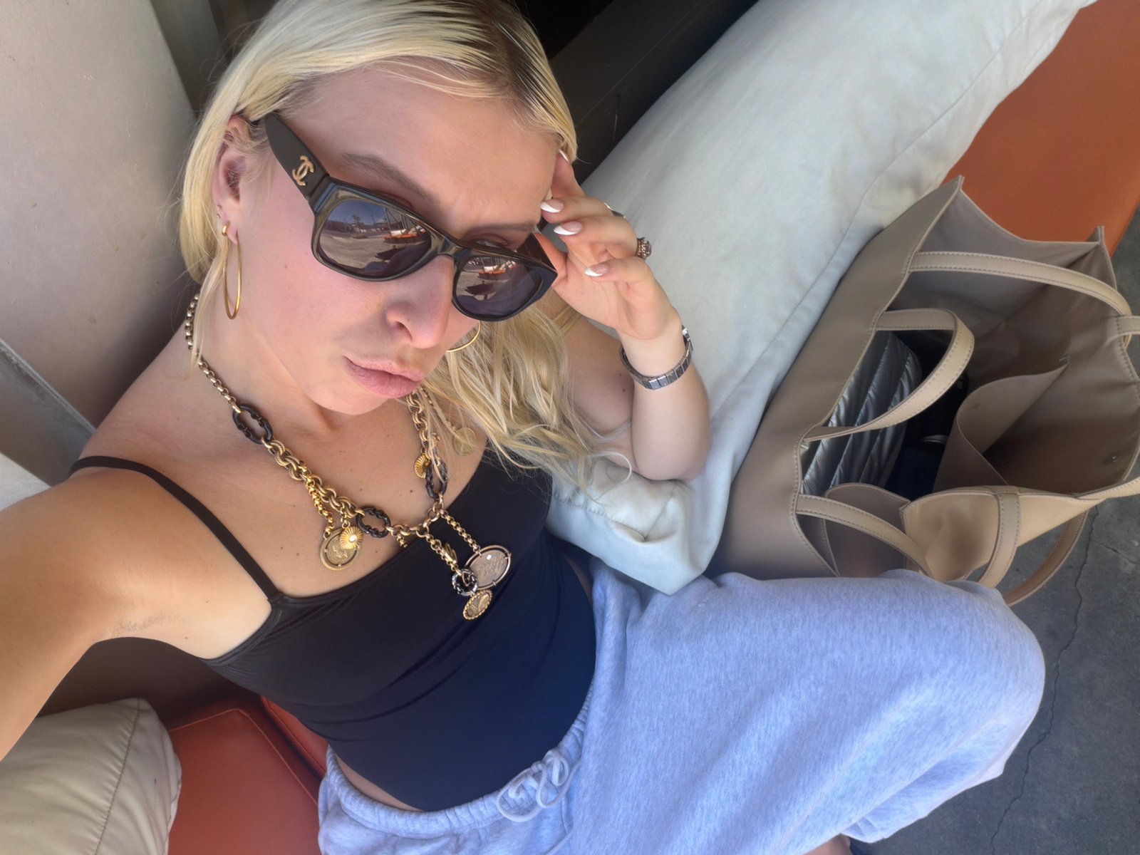 A woman with blonde hair is lying on an outdoor sofa. She is wearing sunglasses with a Chanel logo on the arm, a black tank top, a gold chain necklace, and grey sweatpants. A beige tote bag is next to…read more