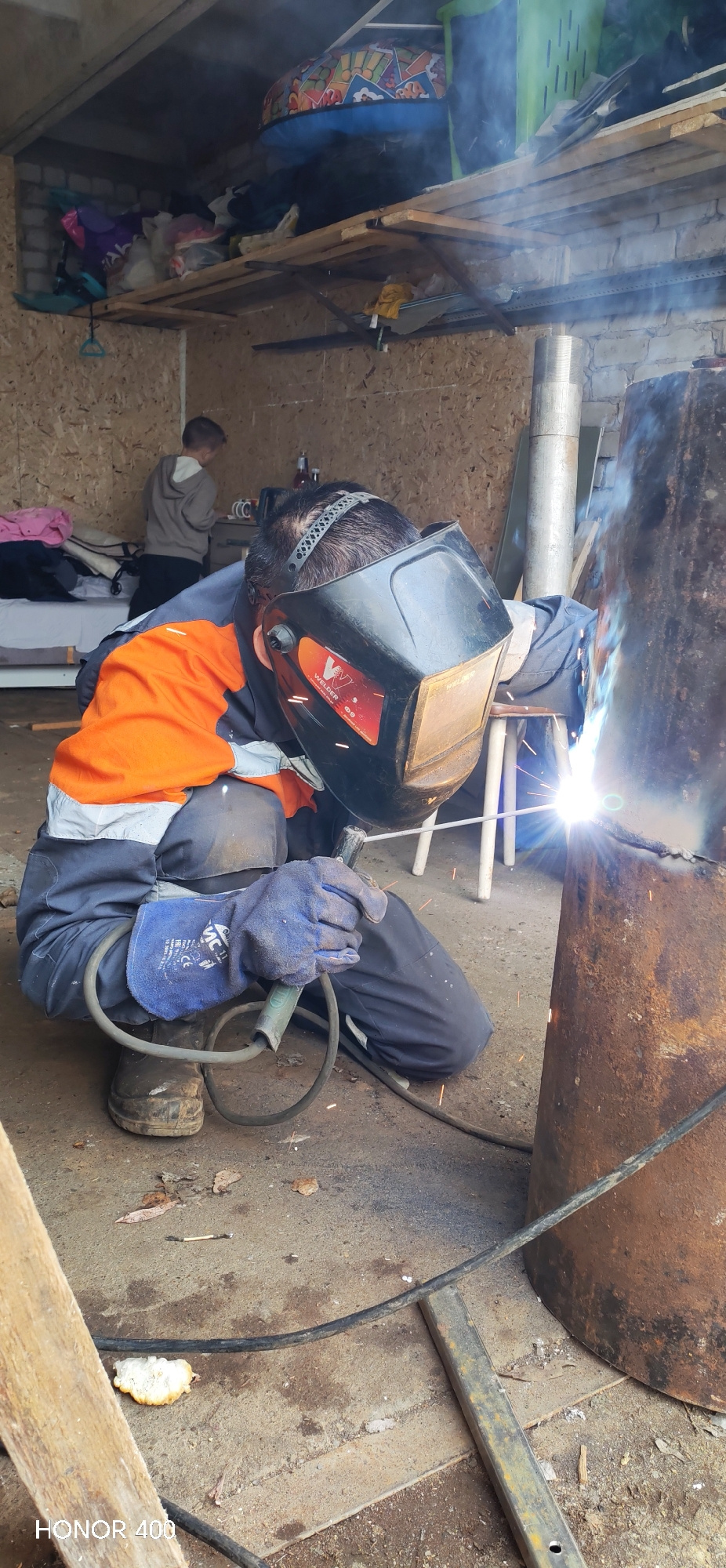 A person is welding a large, rusty metal cylinder in what appears to be an outdoor or semi-enclosed workspace. The person is wearing protective gear including a welding mask, gloves, and a two-toned j…read more
