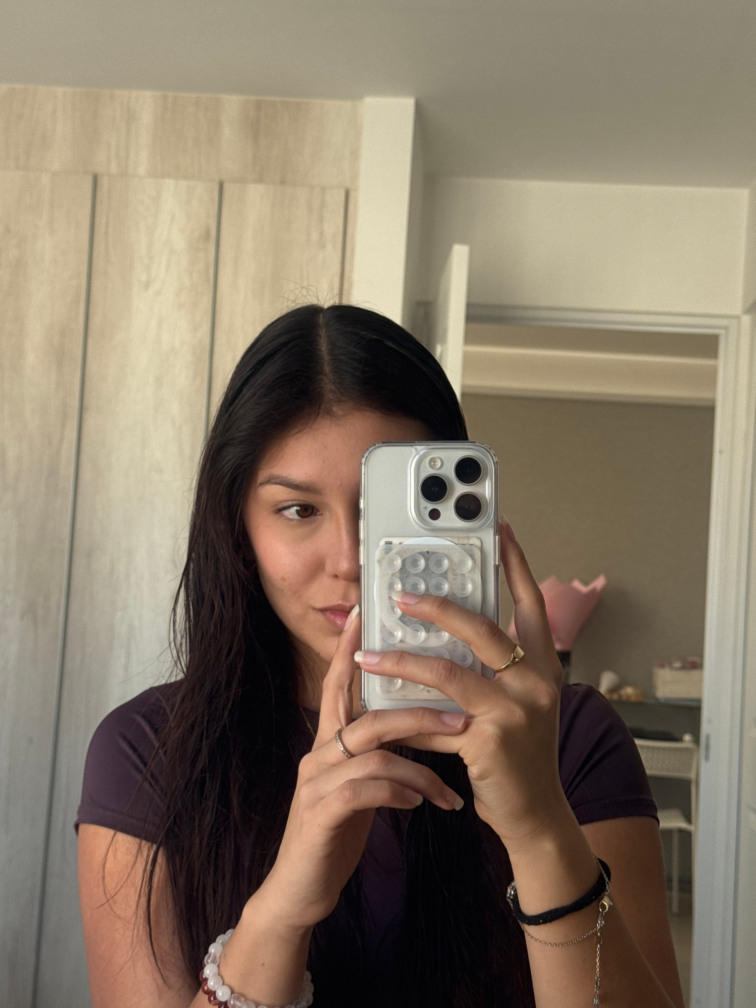 A woman is taking a selfie in front of a mirror. She is holding a phone with a clear case that has a white, circular pattern on the back. She has long, dark hair. Her face is partially obscured by the…read more