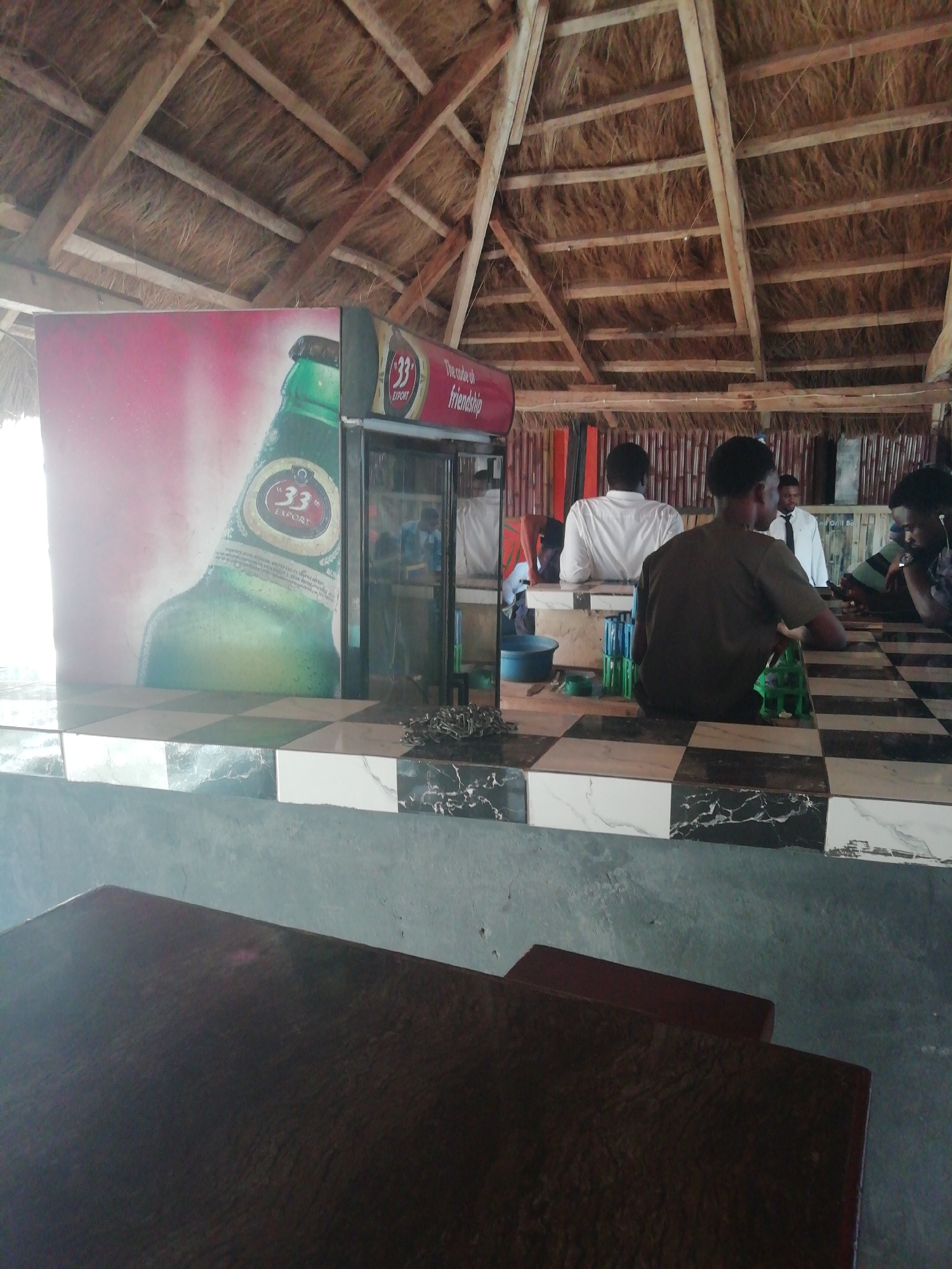 The image shows the interior of an open-air bar in Enugu, Nigeria. The building has a thatched roof. A refrigerator with an advertisement for "33" Export beer is visible, partially blocking the view.…read more