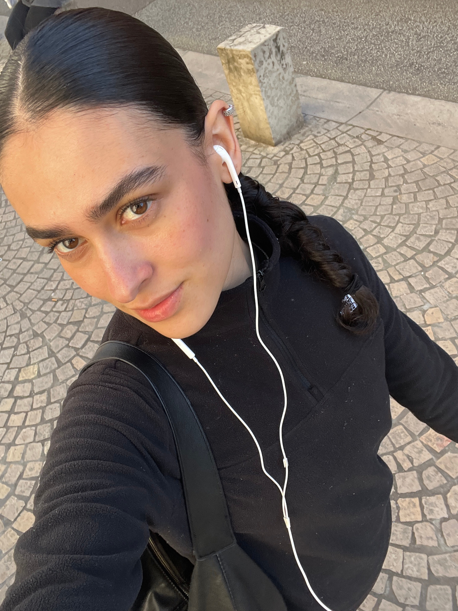 A woman with dark hair braided on one side and pulled back from her face, wearing earphones, is photographed from a high angle, presumably a selfie. She is wearing a black fleece jacket and a dark-col…read more