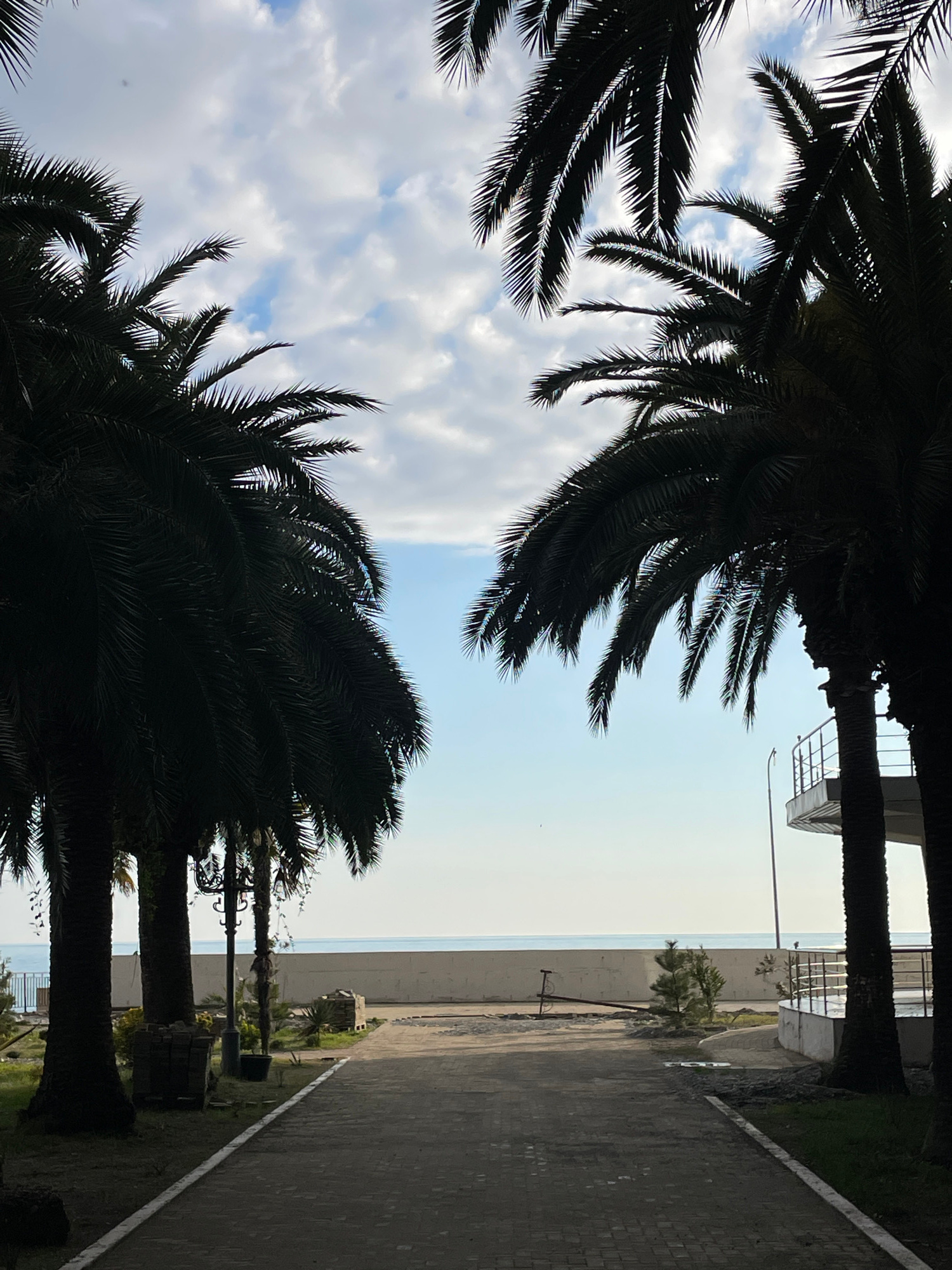 The photograph depicts a view framed by palm trees in Gagra, Abkhazia. The perspective is upward, with palm fronds occupying the foreground and a portion of the sky with clouds visible through them. I…read more
