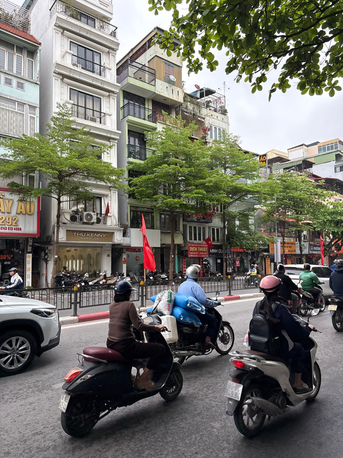 This image depicts a bustling street scene in Hà Nội, Vietnam, under an overcast sky. The foreground features three active motorbikes and a partial view of a white SUV on a damp asphalt road. From le…read more